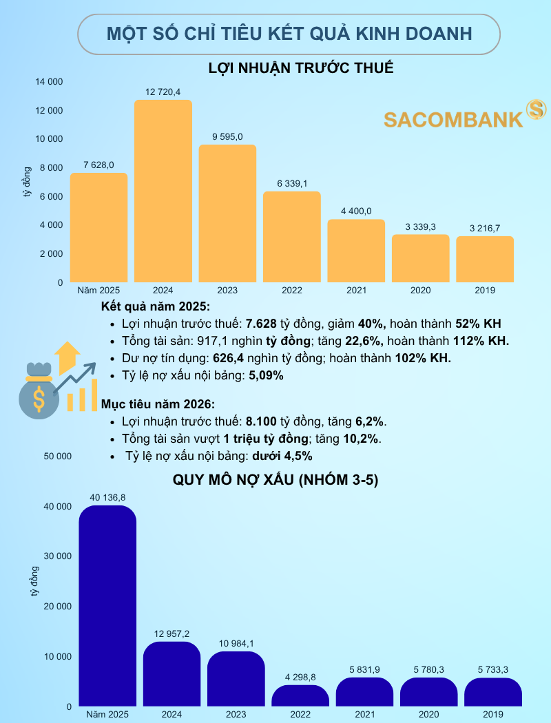 Năm 2026, Sacombank đặt mục tiêu kiểm soát tỷ lệ nợ xấu nội bảng dưới 4,5%. Tổng tài sản vượt 1 triệu tỷ đồng, tăng 10%; dư nợ tín dụng đạt 699.400 tỷ đồng, tăng 12%, hoặc không vượt hạn mức Ngân hàng Nhà nước phê duyệt. Tổng huy động đạt 921.300 tỷ đồng, tăng 10% và điều hành linh hoạt theo tăng trưởng tín dụng.