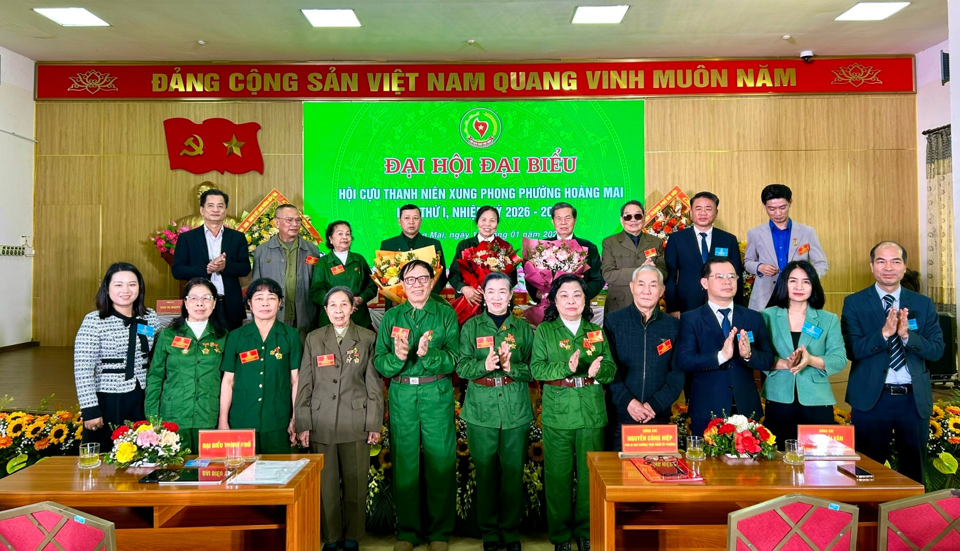 Lãnh đạo Hội Cựu TNXP thành phố Hà Nội và phường Hoàng Mai chúc mừng Ban Chấp hành Hội Cựu TNXP phường Hoàng Mai lần thứ I, nhiệm kỳ 2026 – 2031. Ảnh: PV