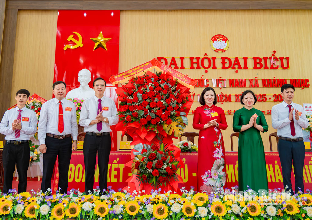 Đồng chí Đào Thị Hòa, Tỉnh ủy viên, Phó Chủ tịch Ủy ban MTTQ Việt Nam tỉnh, Chủ tịch Hội LHPN tỉnh tặng hoa chúc mừng Đại hội đại biểu MTTQ Việt Nam xã Khánh Nhạc lần thứ I, nhiệm kỳ 2025-2030.