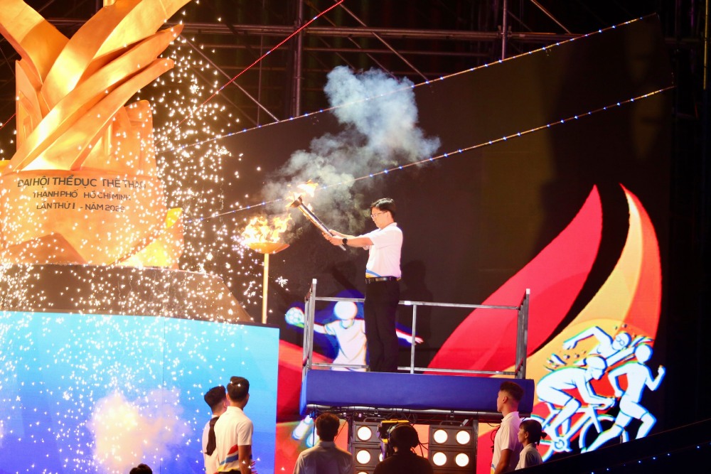 Phó Chủ tịch UBND TPHCM, ông Nguyễn Mạnh Cường thực hiện nghi thức thắp đài lửa truyền thống khai mạc Đại hội.