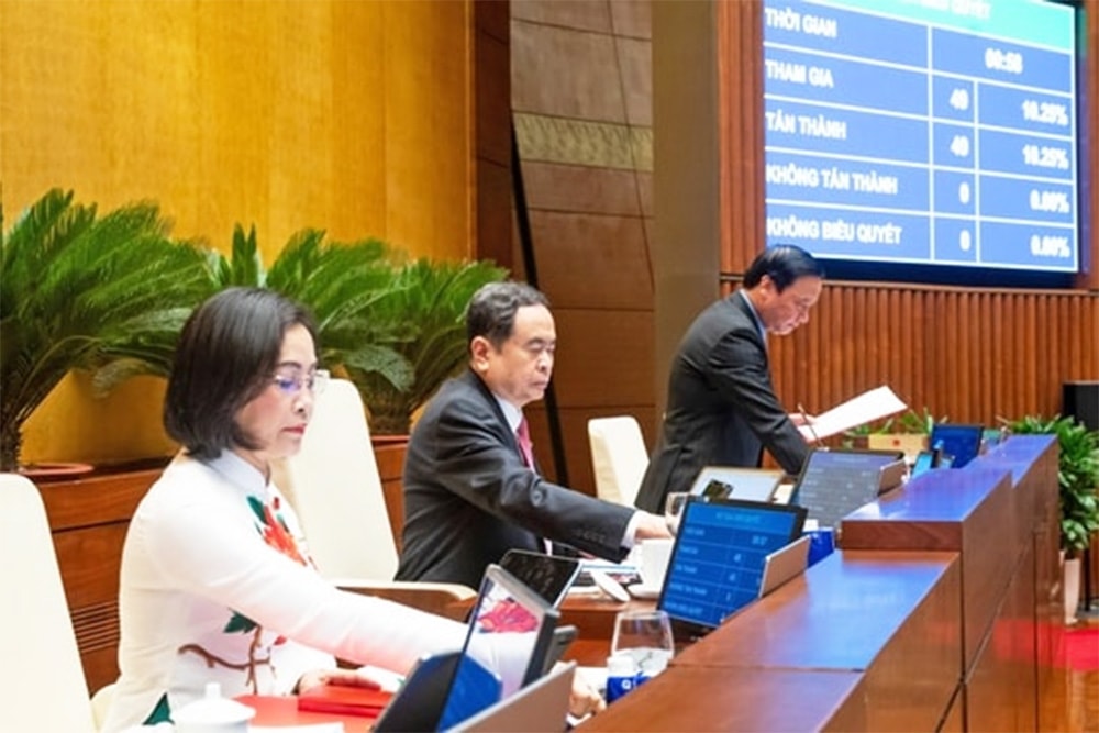Chủ tịch Quốc hội Trần Thanh Mẫn, Phó Chủ tịch Quốc hội Nguyễn Khắc Định và Phó Chủ tịch Quốc hội Nguyễn Thị Thanh biểu quyết thông qua Nghị quyết về việc sắp xếp đơn vị hành chính cấp tỉnh năm 2025 ngày 12/6/2025. Ảnh: Phạm Thắng