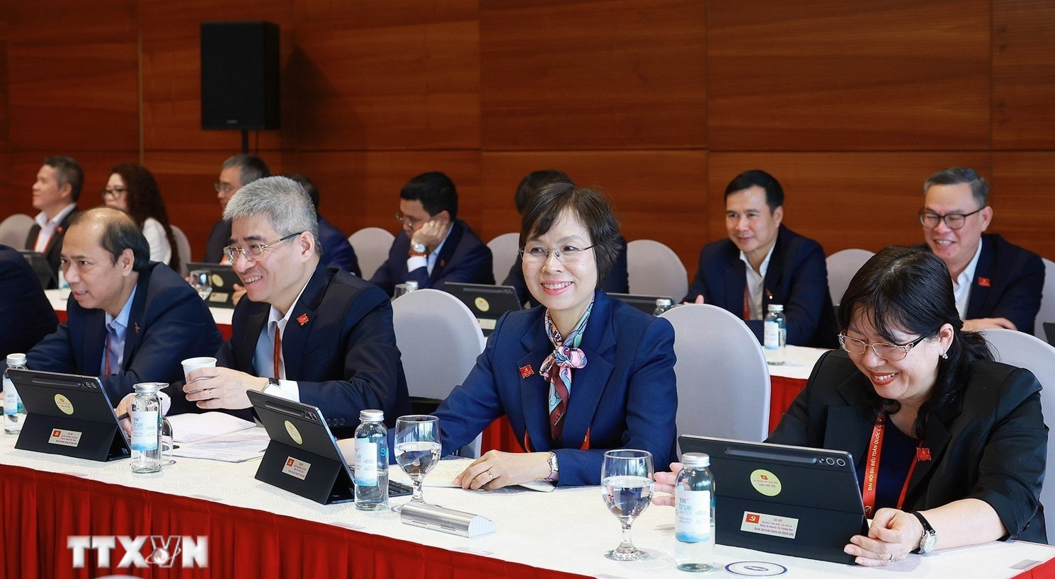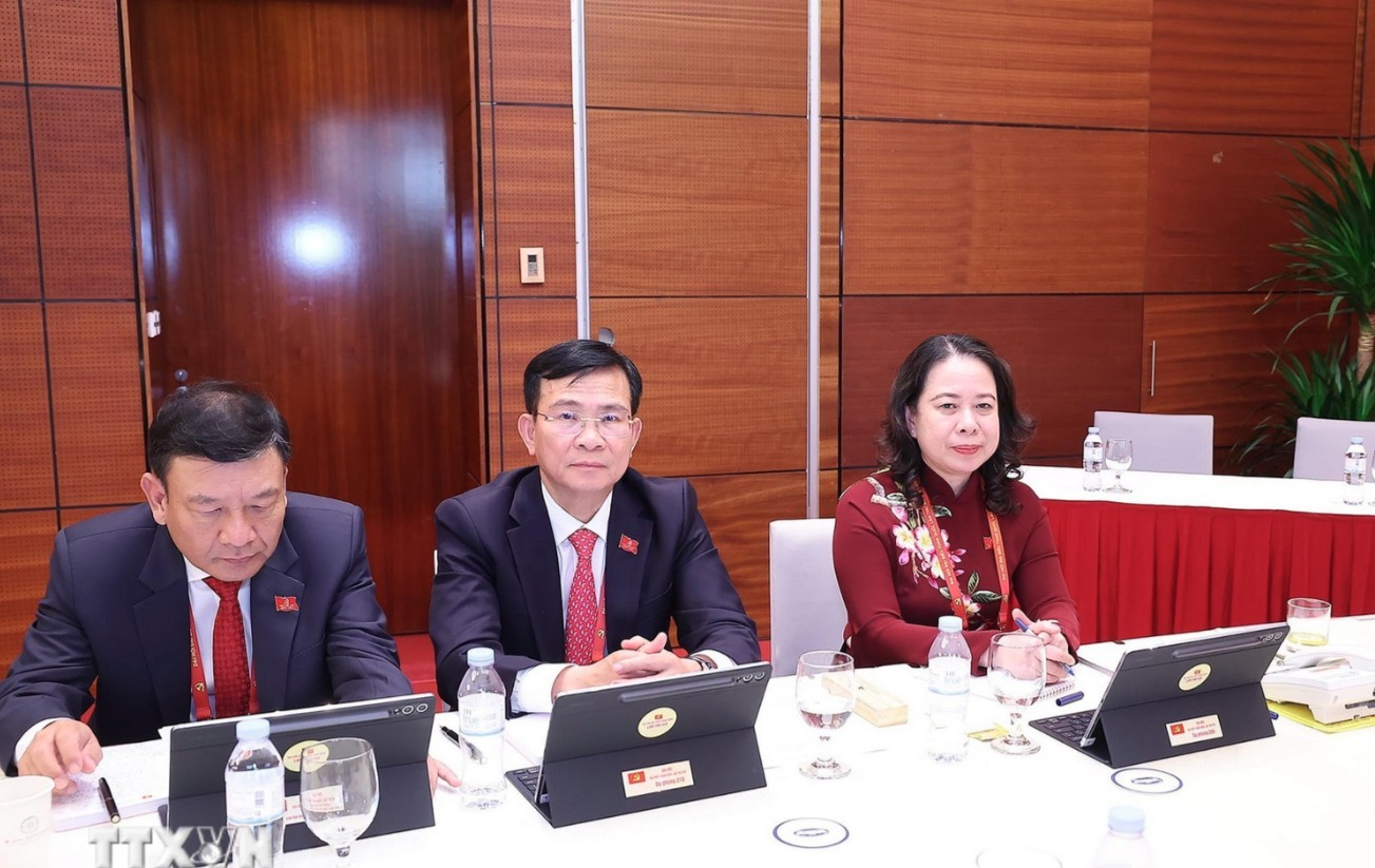 Ủy viên Trung ương Đảng, Phó chủ tịch nước Võ Thị Ánh Xuân và đoàn Đảng bộ tỉnh Lâm Đồng thảo luận tại Đoàn.