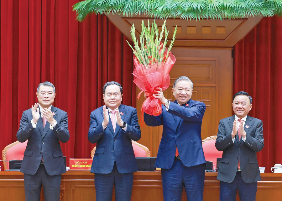 Chủ tịch Quốc hội Trần Thanh Mẫn, Thường trực Ban Bí thư Trần Cẩm Tú, Trưởng Ban Tổ chức Trung ương Lê Minh Hưng chúc mừng Tổng Bí thư Tô Lâm tái đắc cử. Ảnh: TTXVN