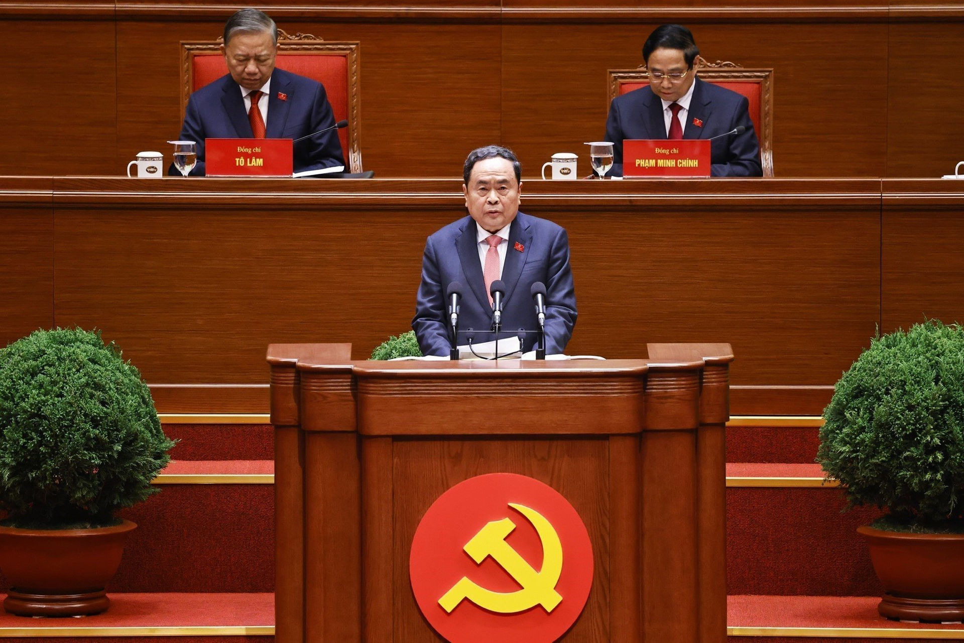 Đồng chí Trần Thanh Mẫn - Ủy viên Bộ Chính trị, Chủ tịch Quốc hội - báo cáo kết quả bầu Bộ Chính trị, Tổng Bí thư, Ban Bí thư, Ủy ban Kiểm tra Trung ương, Chủ nhiệm Ủy ban Kiểm tra Trung ương. Ảnh: TTXVN