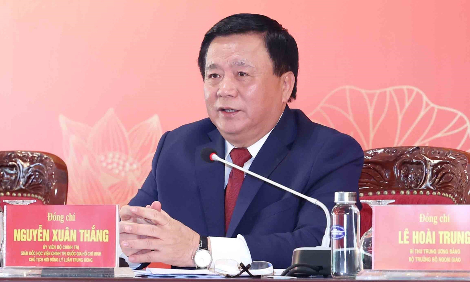 Giám đốc Học viện Chính trị quốc gia Hồ Chí Minh, Chủ tịch Hội đồng Lý luận Trung ương Nguyễn Xuân Thắng, trả lời các câu hỏi của báo chí. (Ảnh: TTXVN)