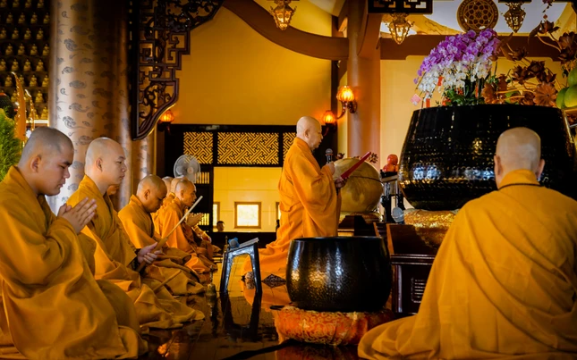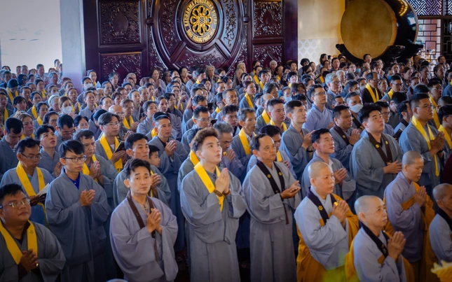 Phật tử tham dự trì tụng kinh Dược Sư tại chùa Huê Nghiêm - Ảnh: Nguyện Truyền