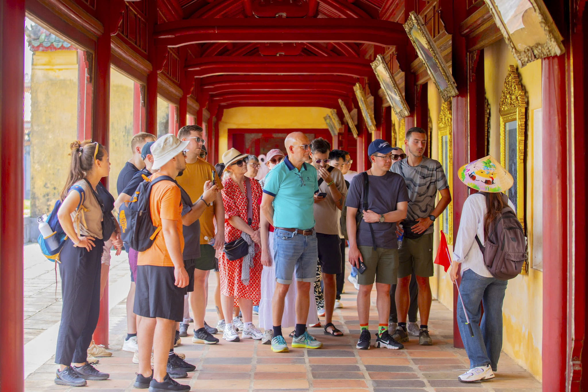 Du khách hào hứng tham quan và nghe thuyết minh về các công trình kiến trúc độc đáo bên trong Hoàng cung.