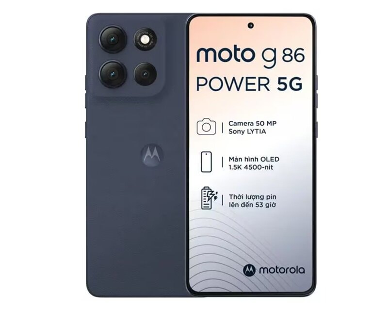 Có giá bán 6,59 triệu đồng, Moto G86 Power 5G tập trung vào thời lượng pin và độ bền. Máy được trang bị viên pin dung lượng 6720 mAh, hỗ trợ sạc nhanh 30W. Về thiết kế, sản phẩm đạt tiêu chuẩn độ bền quân đội MIL STD-810H và kháng nước chuẩn IP69.