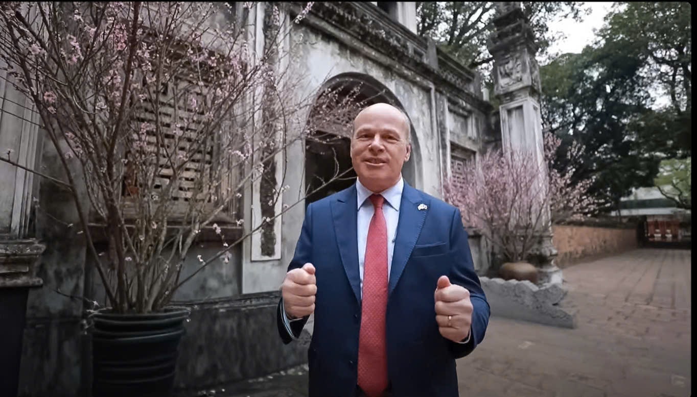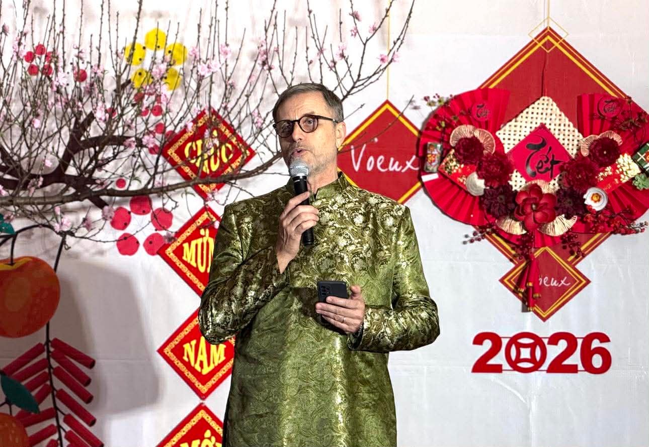 Trong tà áo dài đỏ, Đại sứ Palestine, Trưởng đoàn ngoại giao tại Việt Nam Saadi Salama chia sẻ: "Mỗi độ Tết đến xuân về, sắc đào hồng, mai vàng rực rỡ, phố phường ngập tràn không khí đoàn viên, các gia đình quây quần bên nhau trong hơi ấm yêu thương, tôi luôn cảm nhận sâu sắc trước vẻ đẹp của ngày Tết Việt Nam - một mùa của yêu thương, sum họp và của hy vọng. Trong thời khắc thiêng liên ấy, nhân dịp Xuân Bính Ngọ 2026, tôi xin được gửi tới lãnh đạo Đảng và Nhà nước, cùng toàn thể nhân dân Việt Nam anh em những lời chúc mừng năm mới tốt đẹp và chân thành nhất. Chúc Việt Nam một năm mới tràn đầy niềm tin, mạnh mẽ, đoàn kết và thành công, tiếp tục đổi mới, hội nhập sâu rộng, phát triển bền vững và thịnh vượng. Tôi tin tưởng Việt Nam sẽ luôn là biểu tượng của hòa bình, ổn định, và là người bạn trung thành với tất cả các dân tộc yêu hòa bình trên thế giới.