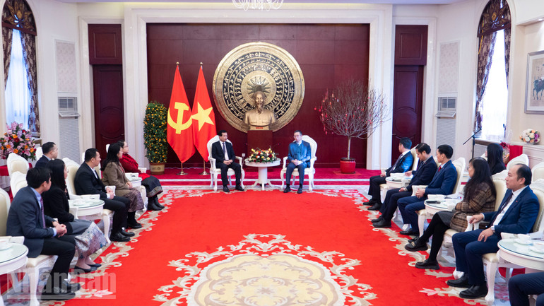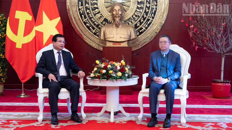 Toàn cảnh buổi tiếp Đại sứ Lào Somphone Sichaleune đến chúc Tết Xuân Bính Ngọ 2026 Đại sứ quán Việt Nam tại Trung Quốc.