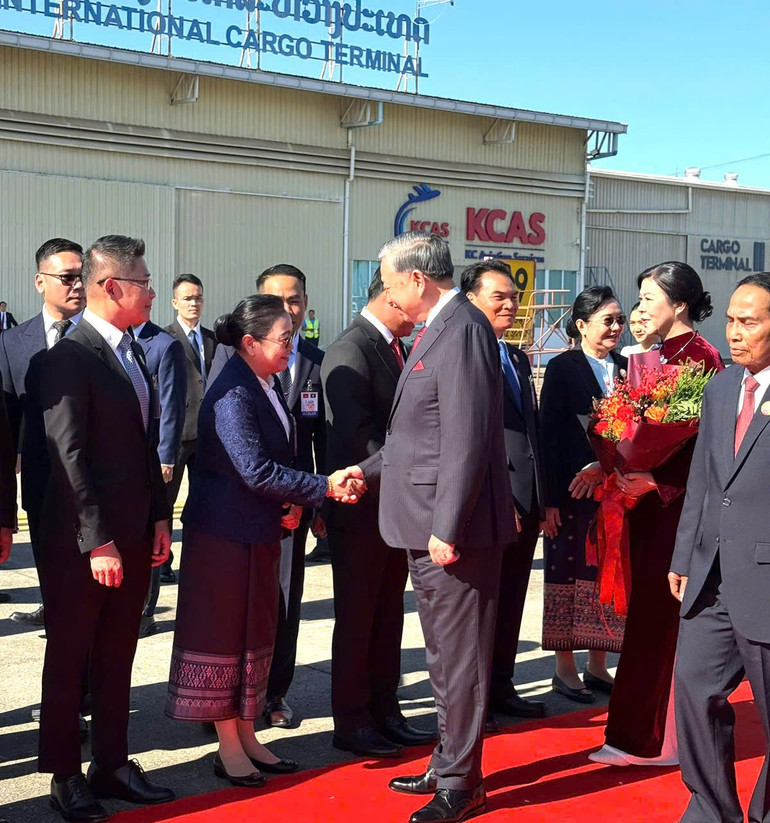 Đại sứ nước Cộng hòa Dân chủ Nhân Dân Lào tại Việt Nam Khamphao Ernthavanh tham dự Lễ đón Tổng Bí thư Tô Lâm và Phu nhân tại sân bay sân bay quốc tế Wattay, Thủ đô Vientiane sáng 1/12. (Ảnh:Đại sứ quán Lào tại Việt Nam)