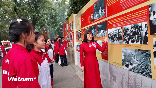 Đông đảo học sinh, sinh viên tham quan triển lãm về Chủ tịch Hồ Chí Minh và Đảng Cộng sản Việt Nam. (Ảnh: Minh Thu/Vietnam+)