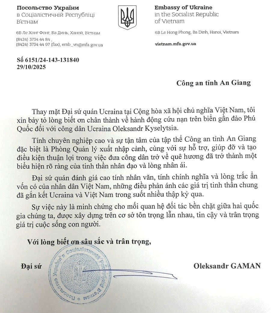 Trong công hàm, Đại sứ quán Ucraina tại Việt Nam đánh giá cao tinh thần nhân đạo, chính nghĩa của Nhân dân Việt Nam, đồng thời ghi nhận sự chuyên nghiệp, tận tâm của lực lượng Công an tỉnh An Giang, đặc biệt là Phòng Quản lý xuất nhập cảnh trong việc hỗ trợ công dân Ucraina tên Oleksandr Kyselytsia gặp nạn trên biển được trở về nước.