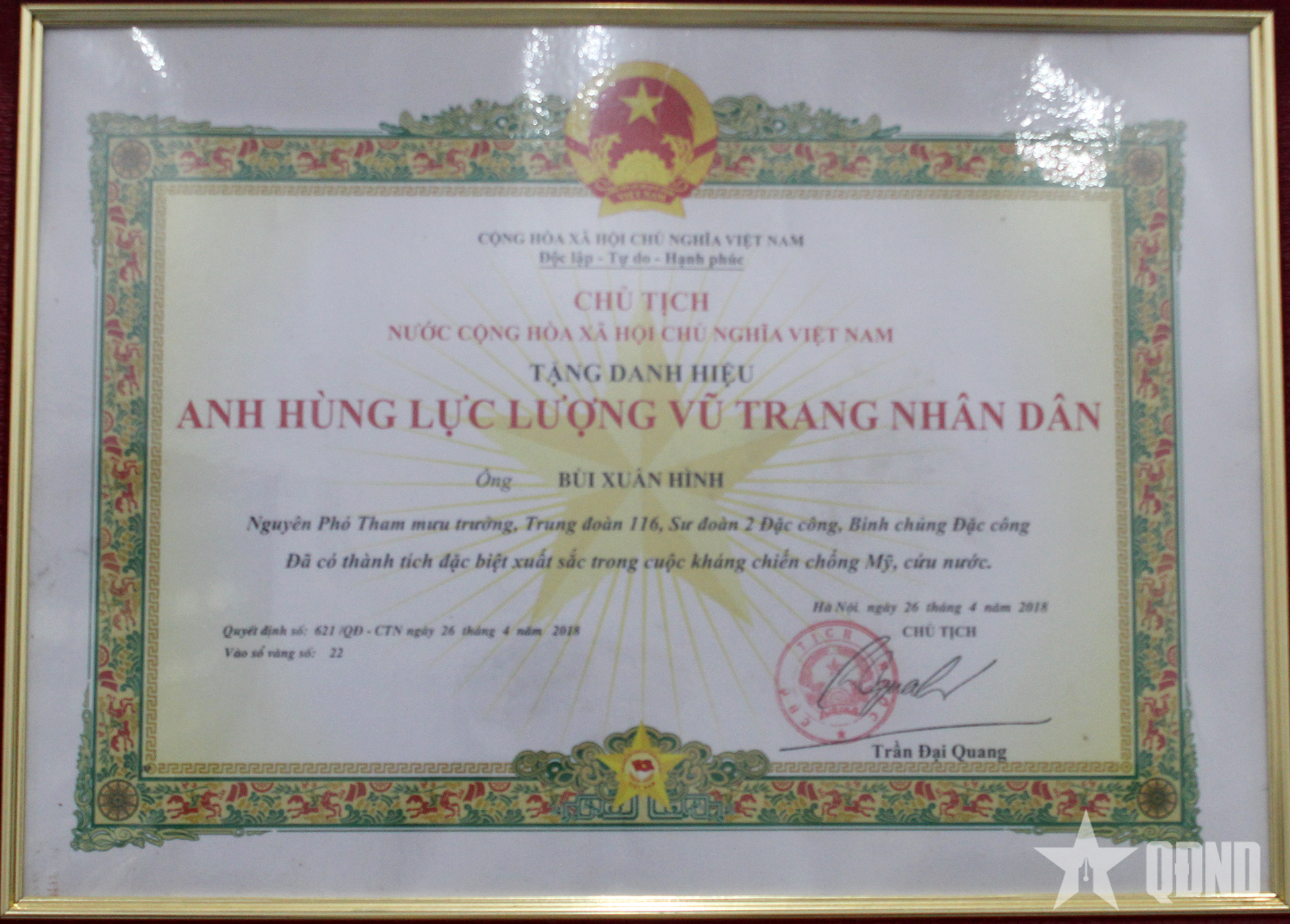 Tháng 4-2018, Đại tá Bùi Xuân Hình được Chủ tịch nước phong tặng danh hiệu Anh hùng LLVT nhân dân.