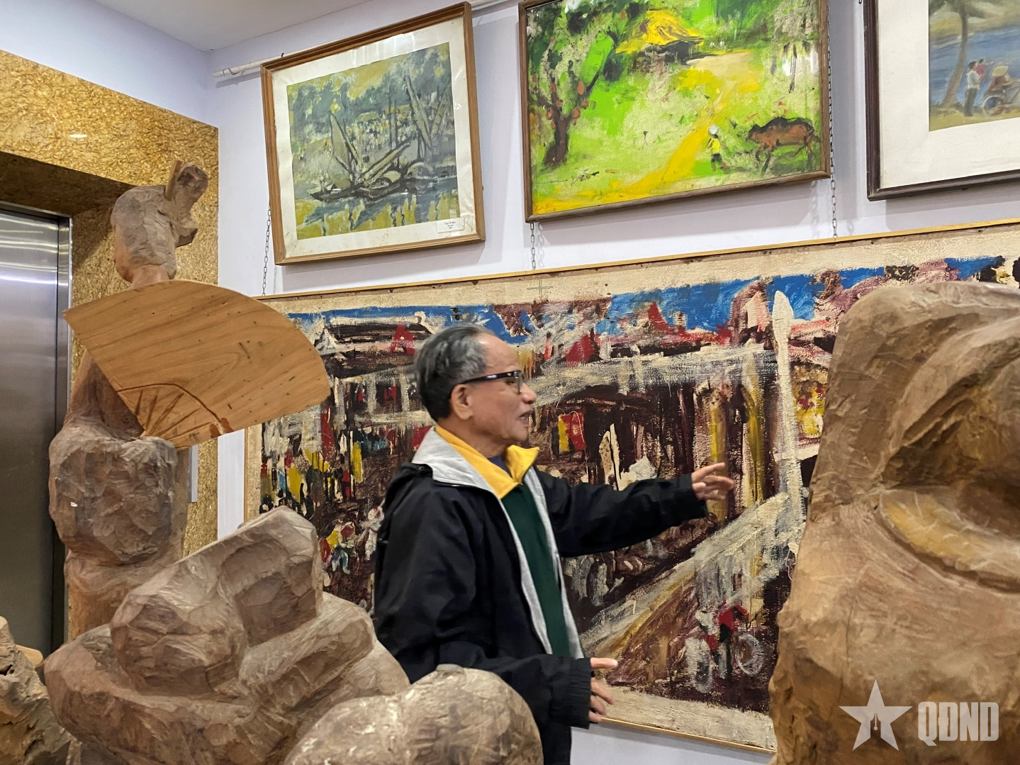 Đại tá, Anh hùng LLVT nhân dân, họa sĩ Lê Duy Ứng giới thiệu các tác phẩm được trưng bày tại nhà. Ảnh: DƯƠNG THU