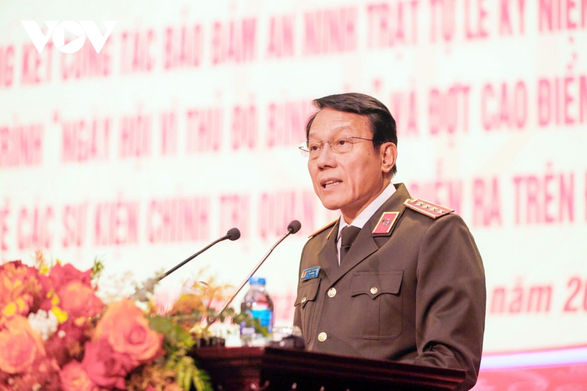 Đại tướng Lương Tam Quang, Bộ trưởng Bộ Công an; Bí thư Thành ủy Hà Nội Nguyễn Duy Ngọc; Trung tướng Nguyễn Thanh Tùng, Giám đốc Công an TP Hà Nội dự và phát biểu tại Hội nghị.
