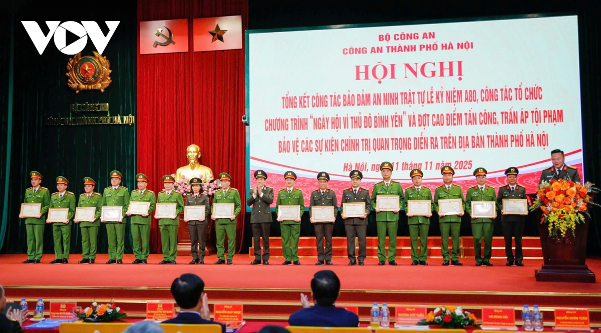 Cũng tại hội nghị, lãnh đạo Bộ Công an, Công an TP Hà Nội đã trao bằng khen của Bộ trưởng Bộ Công an, Thành ủy, UBND TP Hà Nội cho các cá nhân, tập thể có thành tích xuất sắc trong công tác bảo đảm an ninh trật tự Lễ kỷ niệm A80, công tác tổ chức “Ngày hội Vì Thủ đô bình yên” và Đợt cao điểm tấn công trấn áp tội phạm.