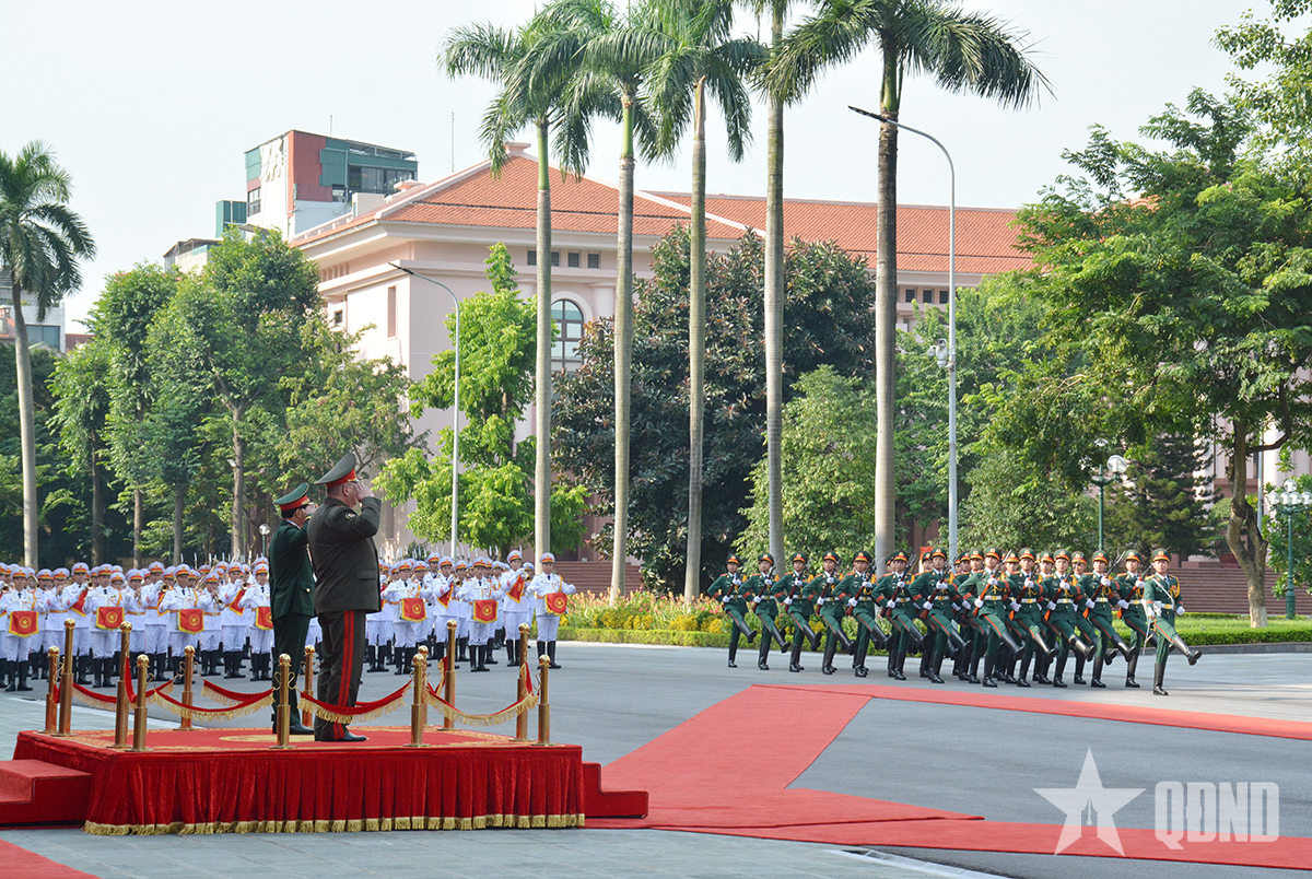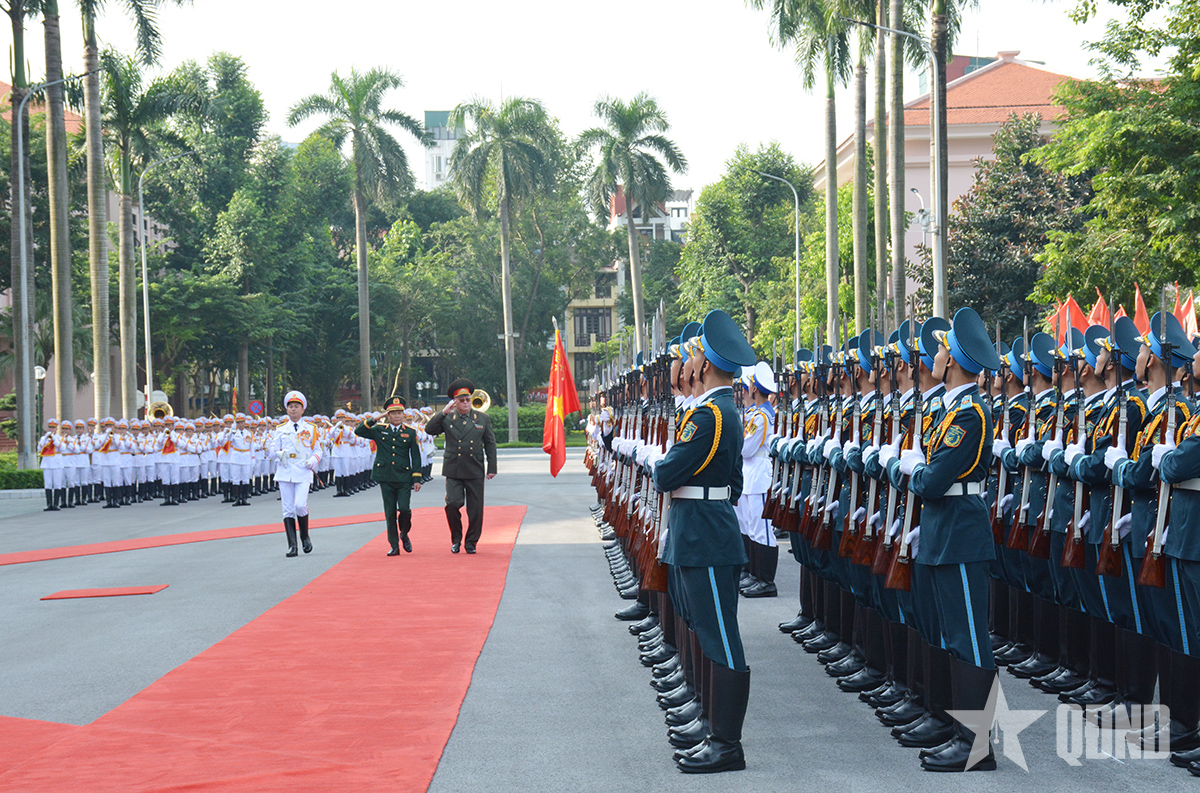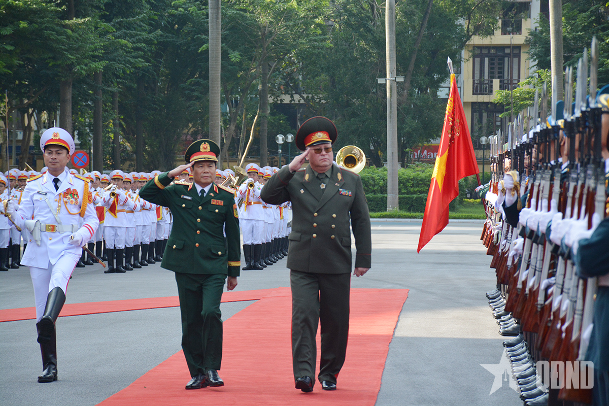 Đại tướng Nguyễn Tân Cương và Thiếu tướng Pavel Muraveiko duyệt Đội danh dự Quân đội nhân dân Việt Nam.