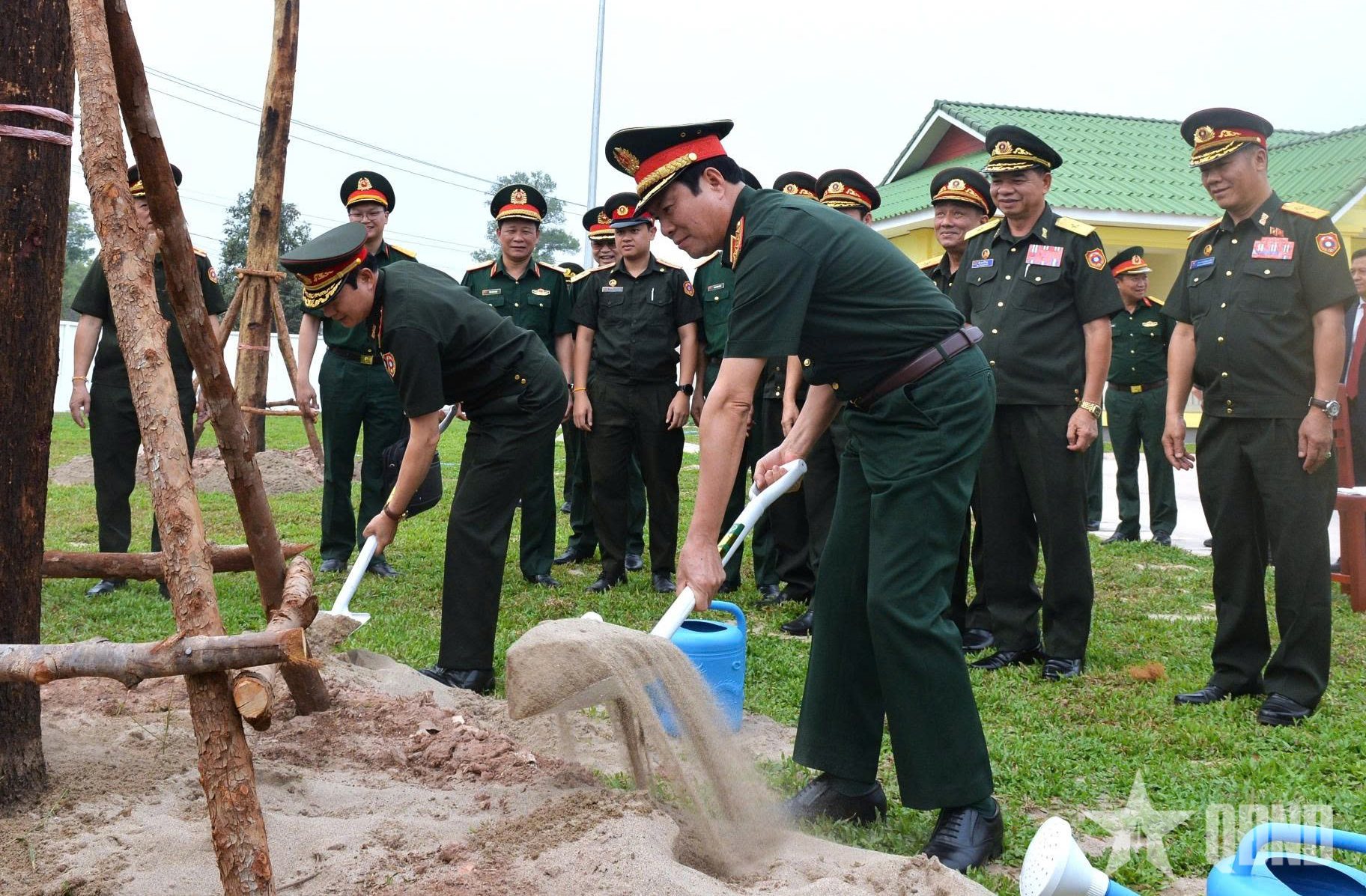 Đại tướng Nguyễn Tân Cương và Thượng tướng Saichay Kommasith trồng cây lưu niệm tại khuôn viên trụ sở Bộ tư lệnh Bộ đội Biên phòng Lào.