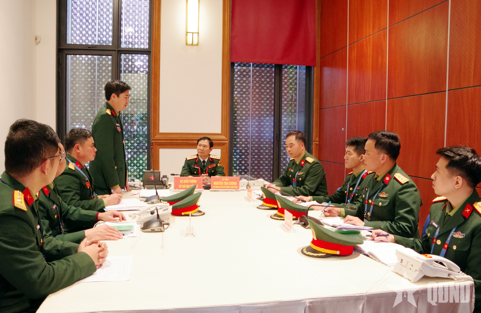 Đại tướng Nguyễn Tân Cương trực tiếp điện đàm kiểm tra công tác trực của các đơn vị. Ảnh: TIẾN TUẤN