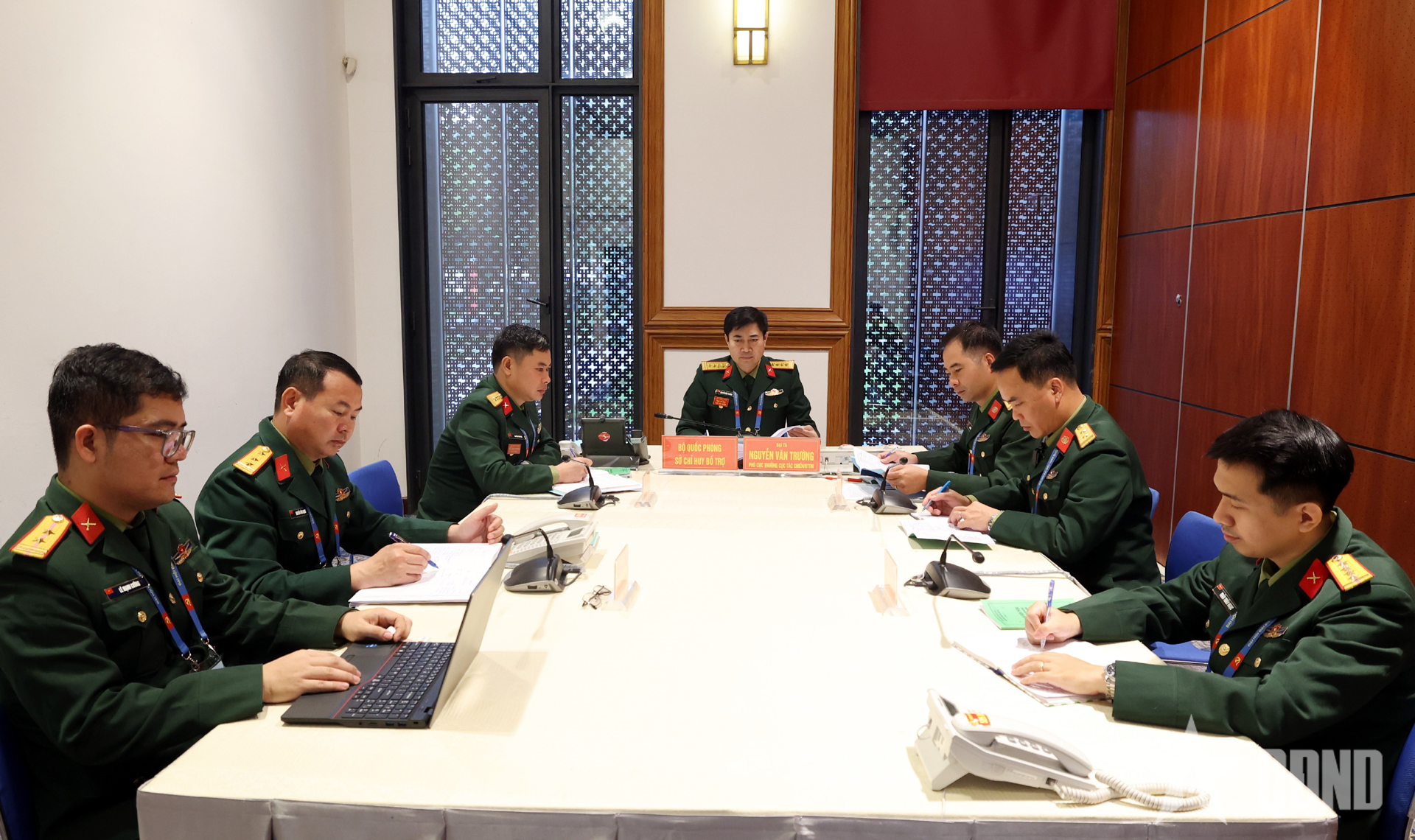 Đại tướng Nguyễn Tân Cương cùng các lực lượng trực tại Sở chỉ huy bổ trợ của Bộ Quốc phòng. Ảnh: VĂN GIANG