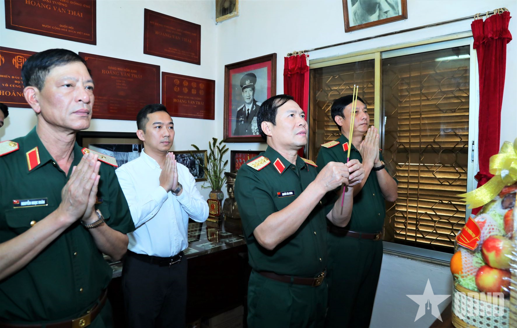 Đại tướng Nguyễn Tân Cương cùng đoàn công tác thắp hương tri ân Đại tướng Hoàng Văn Thái.