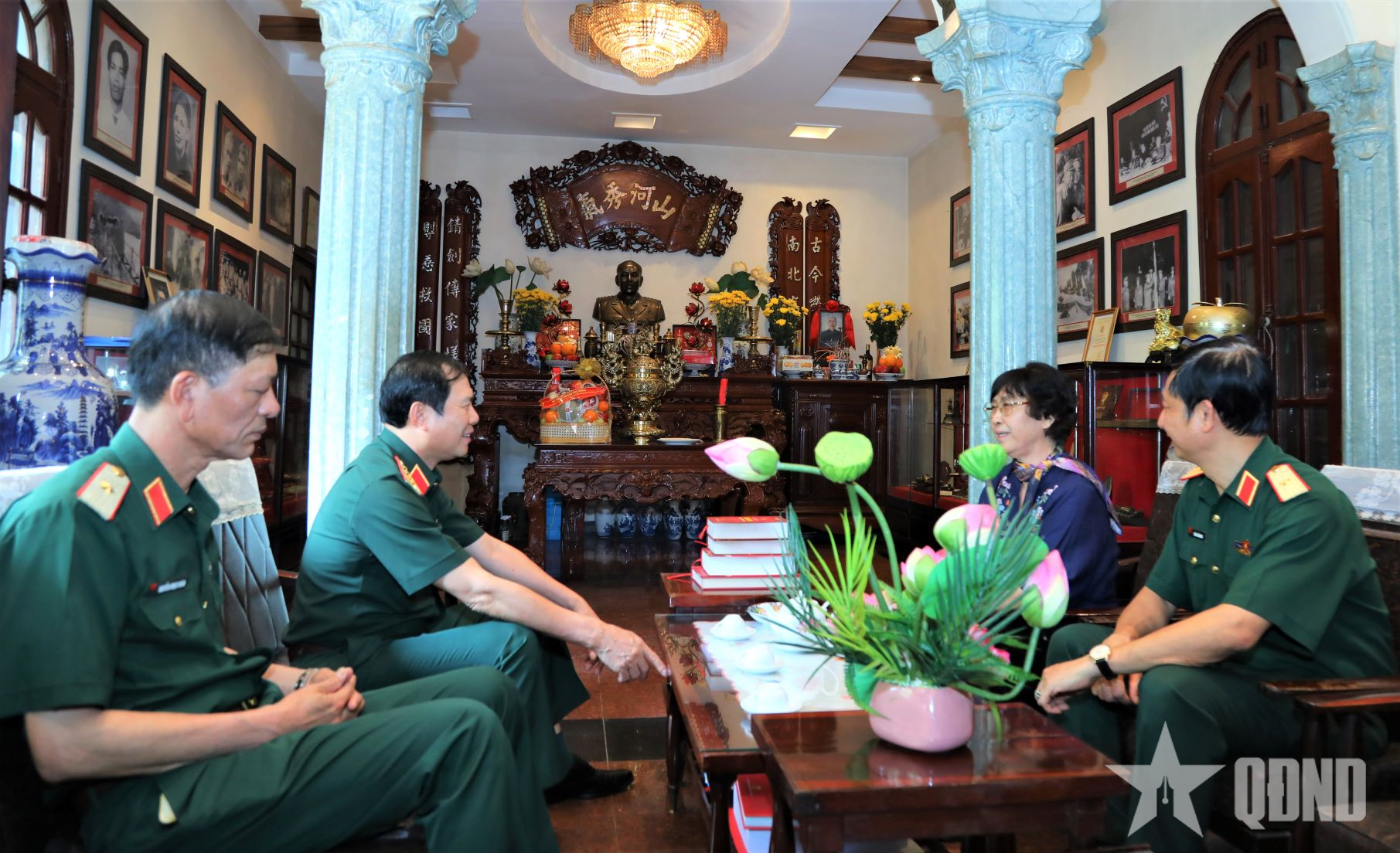 Đại tướng Nguyễn Tân Cương và đoàn công tác trò chuyện cùng thân nhân Đại tướng Văn Tiến Dũng.