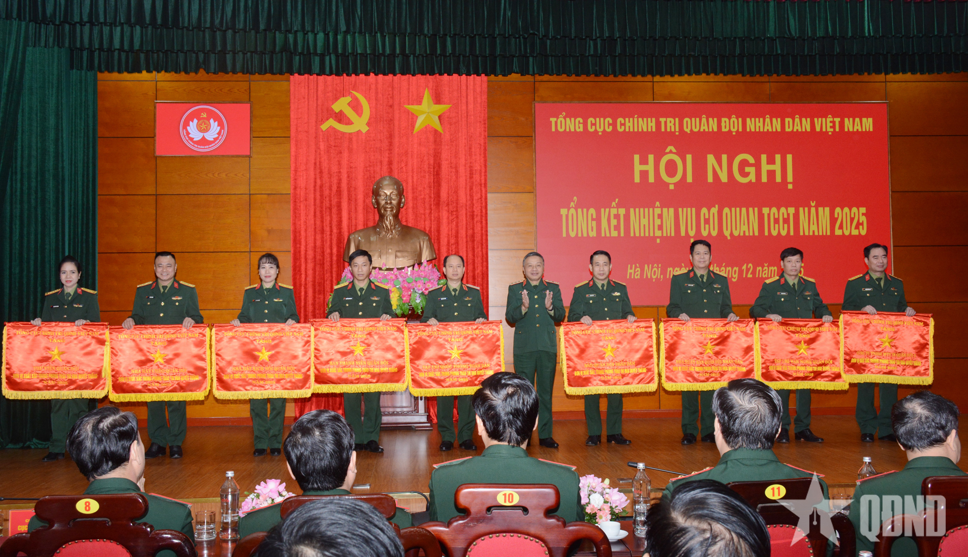 Thượng tướng Lê Quang Minh trao cờ của Tổng cục Chính trị tặng các tập thể có thành tích xuất sắc trong Phong trào Thi đua Quyết thắng năm 2025.