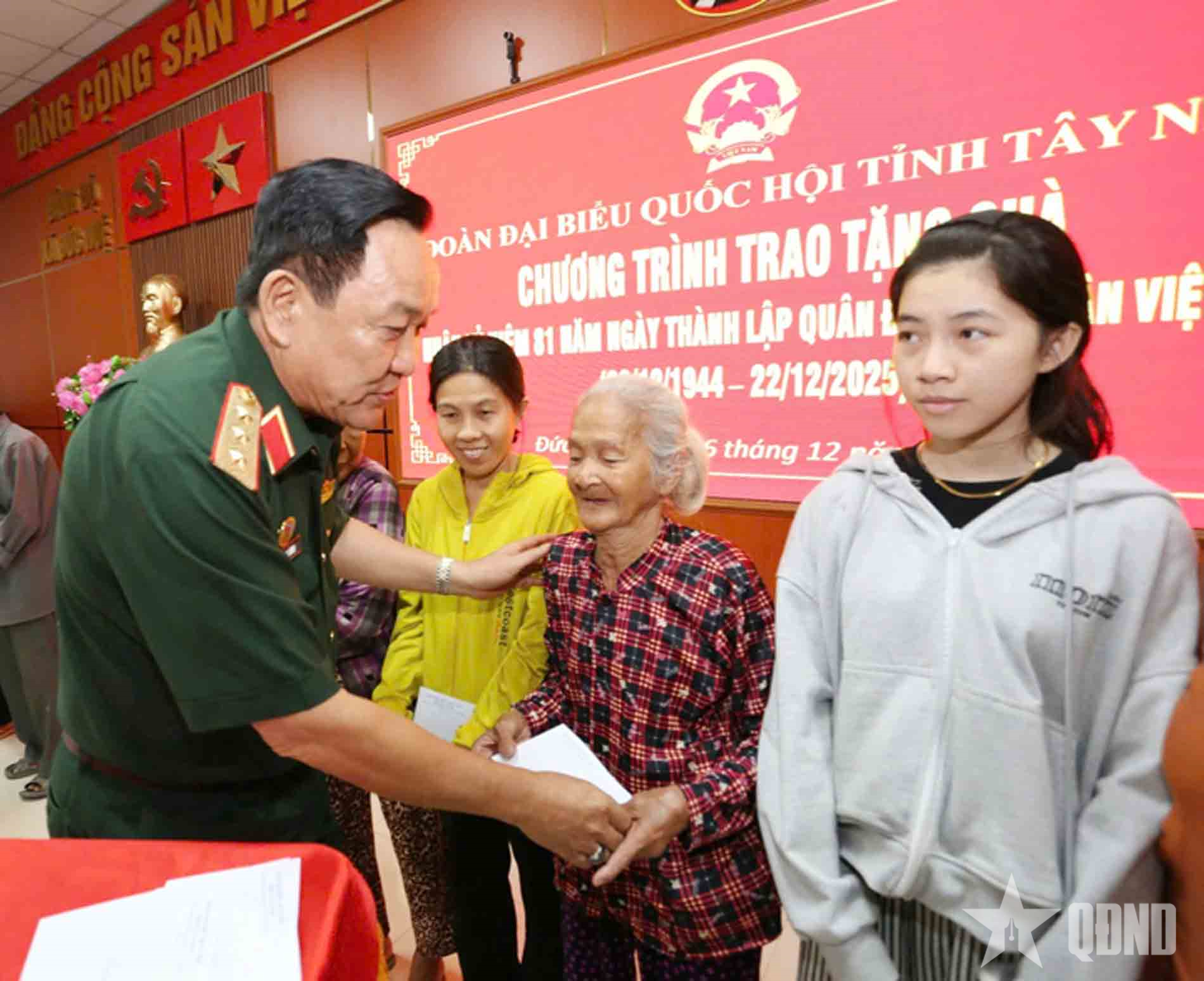 Dịp này, Đại tướng Nguyễn Trọng Nghĩa và các đồng chí lãnh đạo Bộ Quốc phòng, các đại biểu đã cùng Đoàn đại biểu Quốc hội tỉnh Tây Ninh tổ chức thăm, tặng quà các đối tượng chính sách, người dân khó khăn trên địa bàn tỉnh Tây Ninh nhân kỷ niệm 81 năm Ngày thành lập Quân đội nhân dân Việt Nam (22-12-1944/22-12-2025).