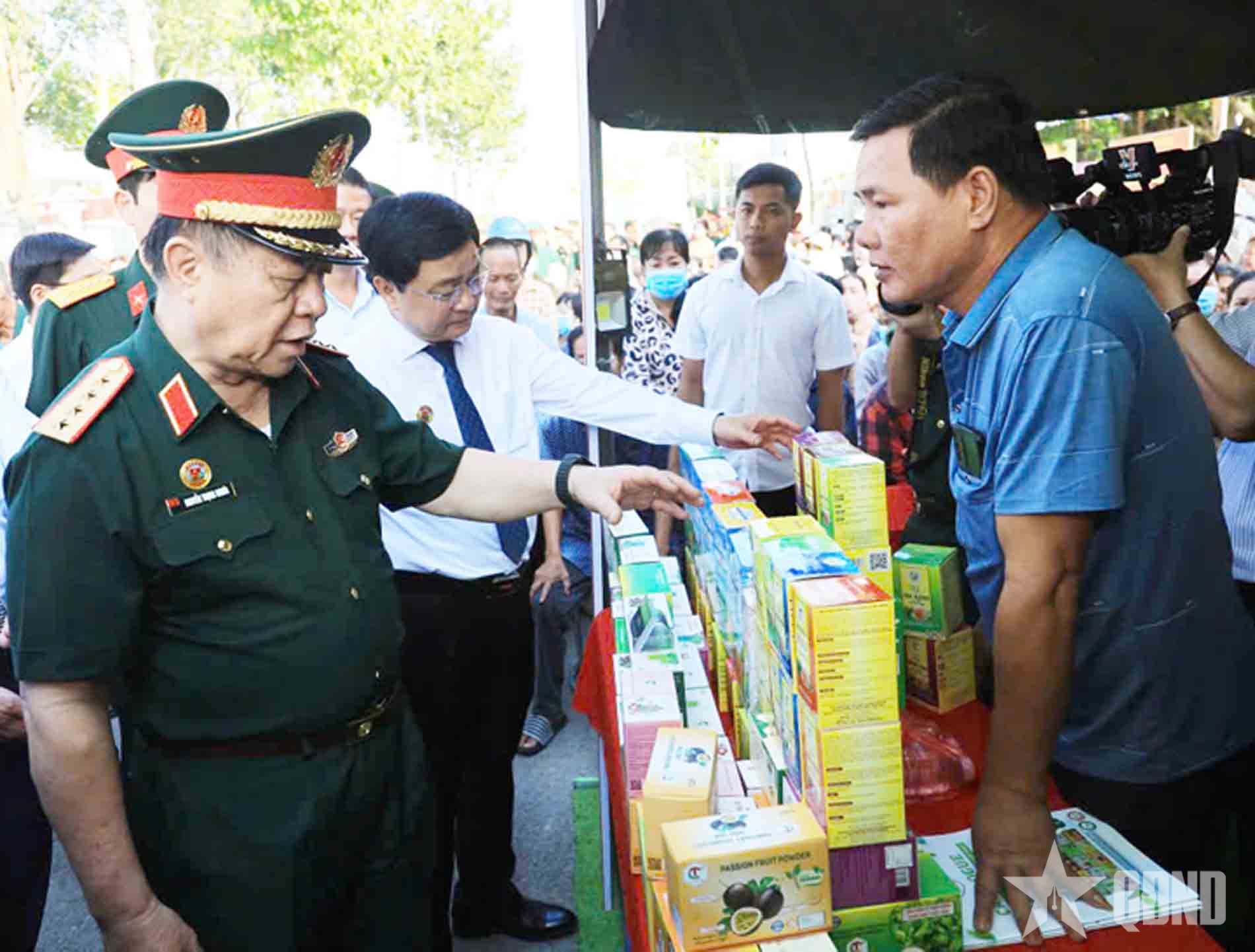 Đại tướng Nguyễn Trọng Nghĩa tham quan gian hàng trưng bày của Quân khu 7 trong chương trình về nguồn.
