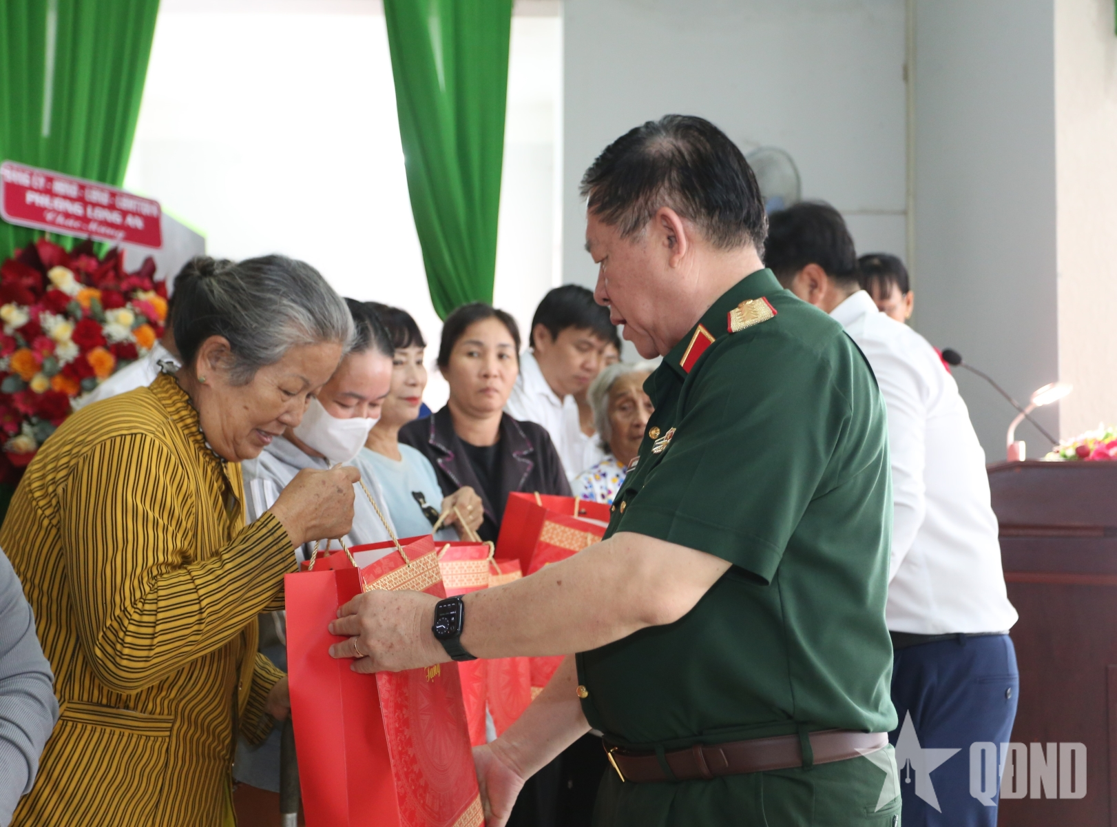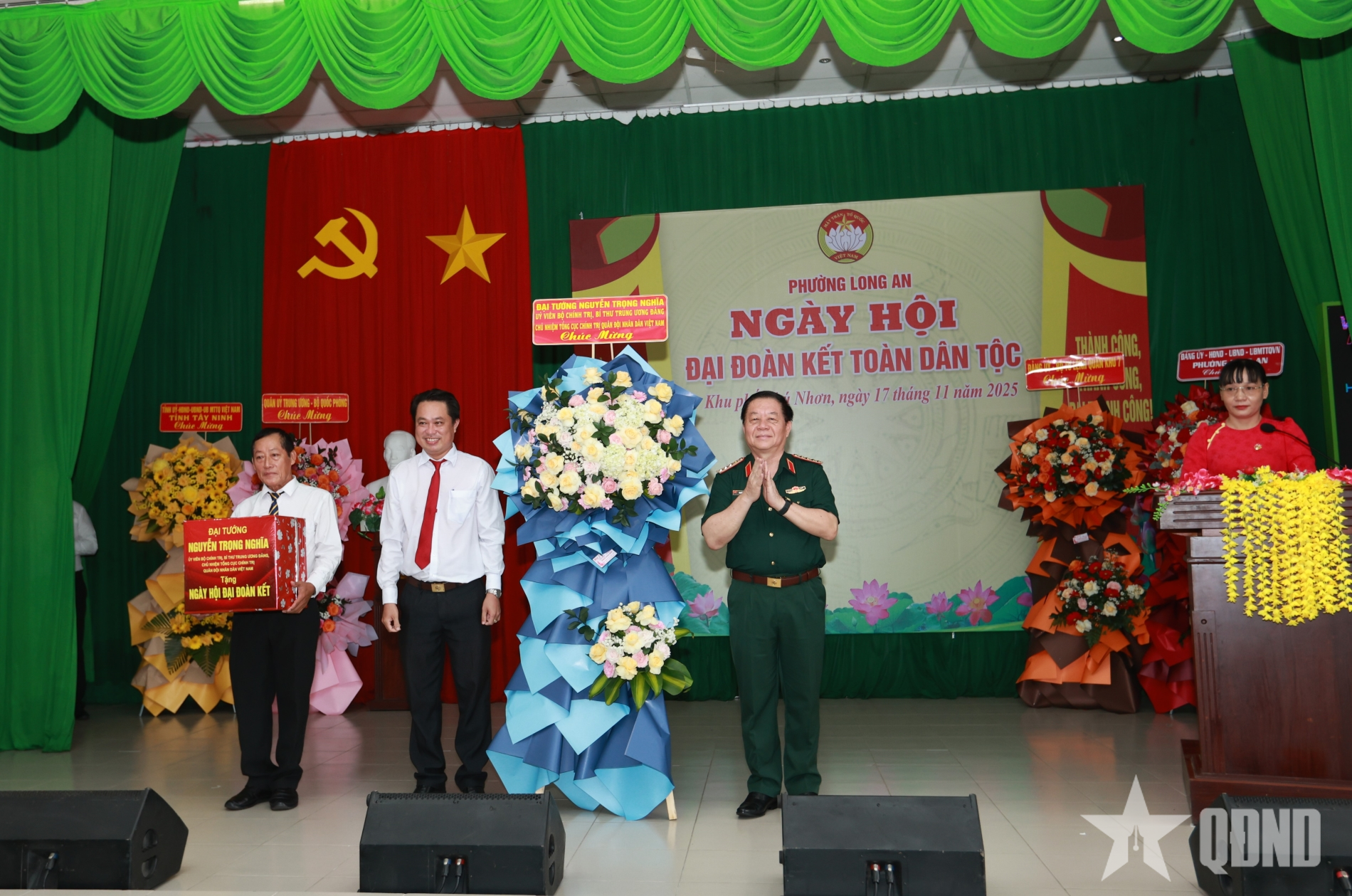 Đại tướng Nguyễn Trọng Nghĩa trao lẵng hoa và quà của Quân ủy Trung ương, Bộ Quốc phòng tặng phường Long An, khu phố Phú Nhơn.