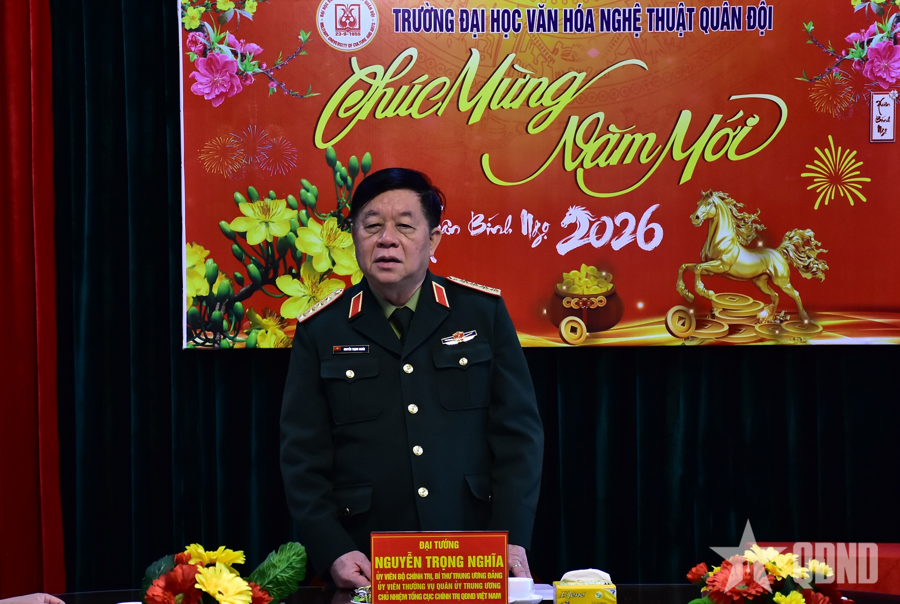 Nhân dịp Tết Nguyên đán, Đại tướng Nguyễn Trọng Nghĩa chúc cán bộ, giảng viên, học viên Trường Đại học Văn hóa Nghệ thuật Quân đội đón Tết vui tươi, lành mạnh, an toàn, tiết kiệm; đồng thời yêu cầu Nhà trường duy trì nghiêm chế độ trực sẵn sàng chiến đấu, chăm lo tốt đời sống vật chất, tinh thần cho cán bộ, giảng viên, học viên; tổ chức thăm hỏi các đối tượng chính sách, cán bộ nghỉ hưu; bảo đảm tuyệt đối an toàn mọi mặt.