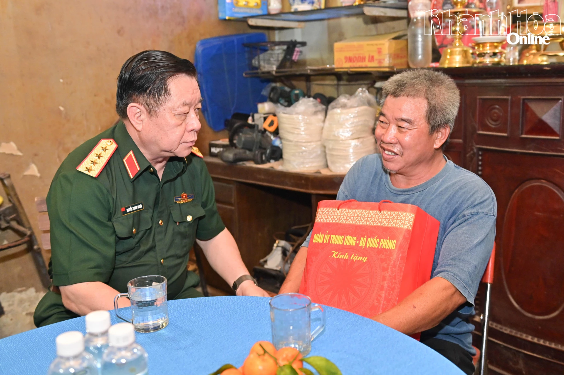 Đại tướng Nguyễn Trọng Nghĩa tặng quà cho ông Nguyễn Thành Phong.
