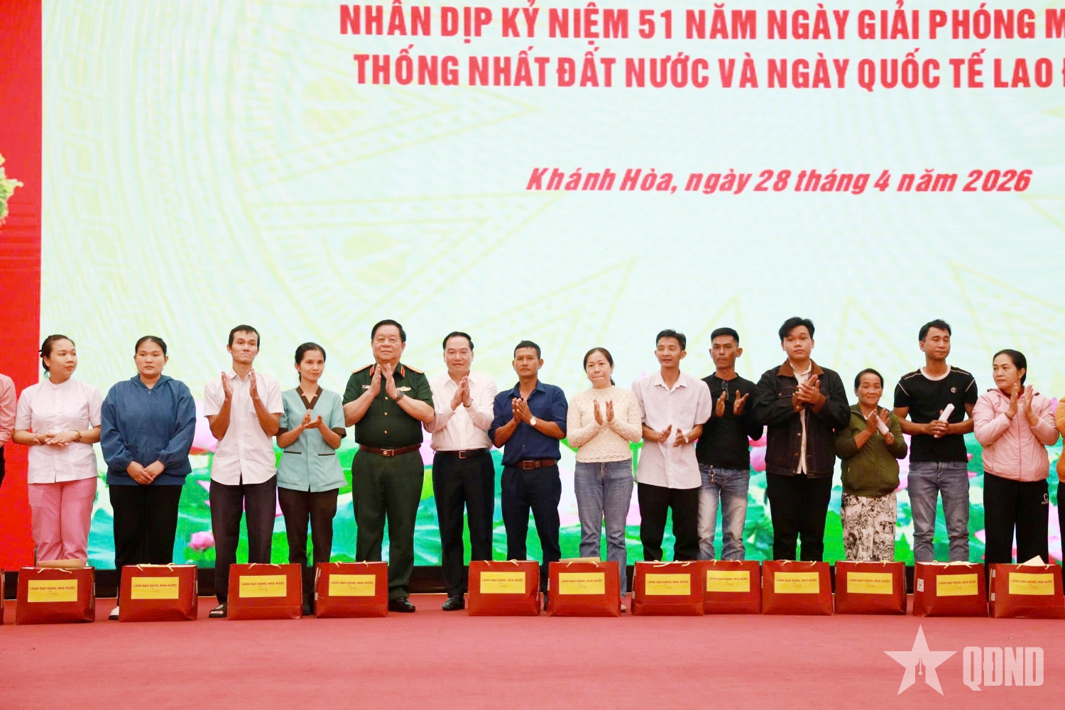 Đại tướng Nguyễn Trọng Nghĩa và lãnh đạo tỉnh Khánh Hòa trao quà tặng gia đình chính sách.