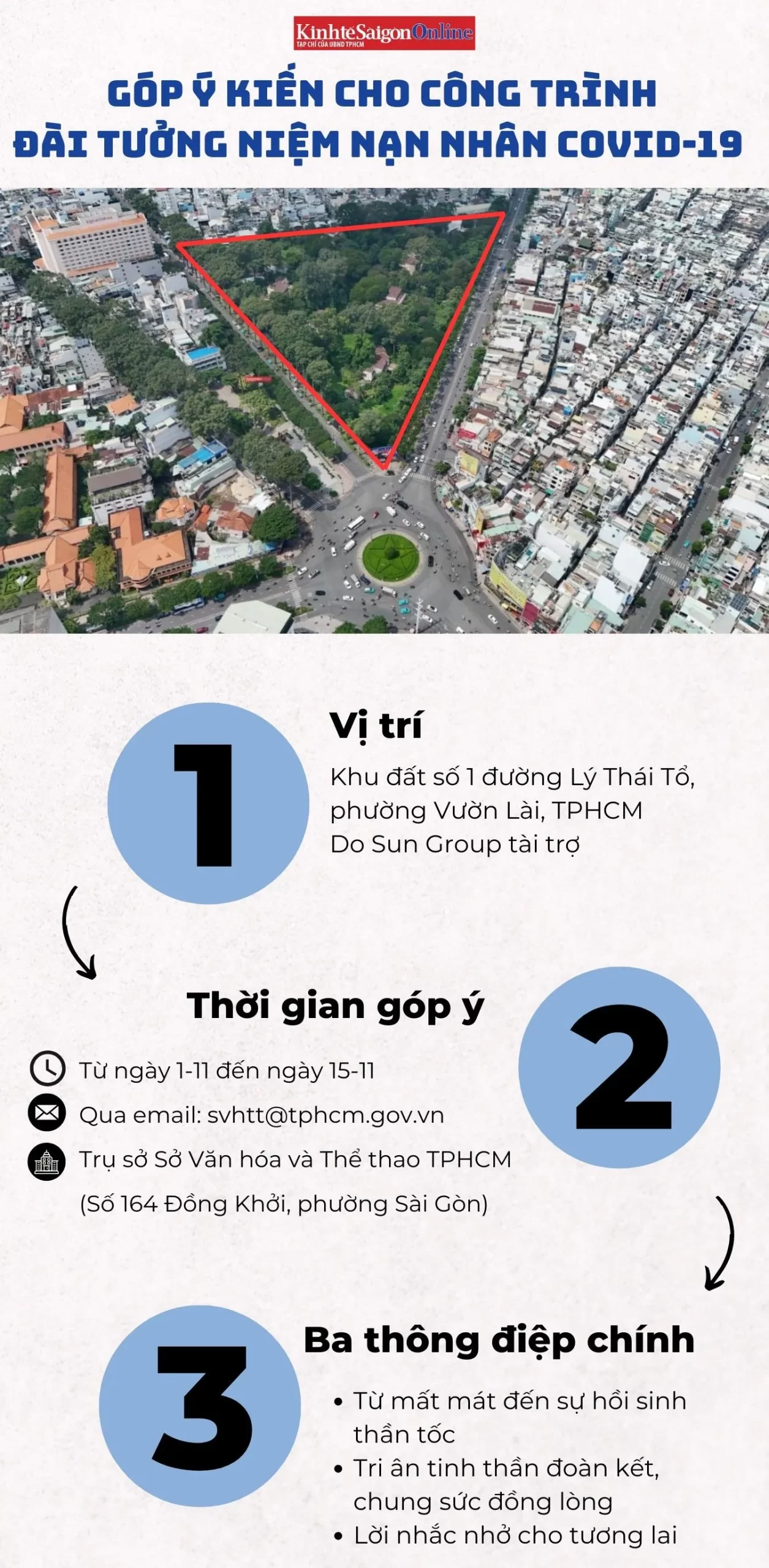 Giữa khu đất vàng hơn 37.000m2 ở số 1 đường Lý Thái Tổ, phường Vườn Lài - nơi ba trục đường lớn Lý Thái Tổ, Hùng Vương và Trần Bình Trọng giao nhau - TPHCM đang khởi động một dự án mang tính biểu tượng: xây dựng công viên kết hợp đài tưởng niệm nạn nhân Covid-19.