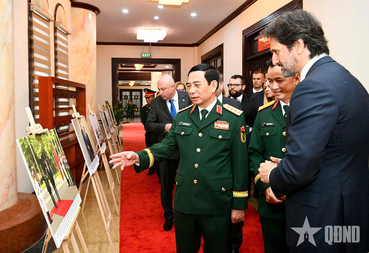 Đại tướng Phan Văn Giang và Phó thủ tướng, Bộ trưởng Bộ Quốc phòng Slovakia Robert Kalinak tham quan trưng bày ảnh về quan hệ hợp tác giữa hai nước. Ảnh: TUẤN HUY