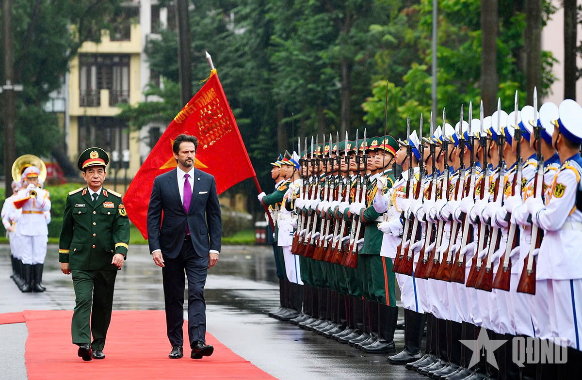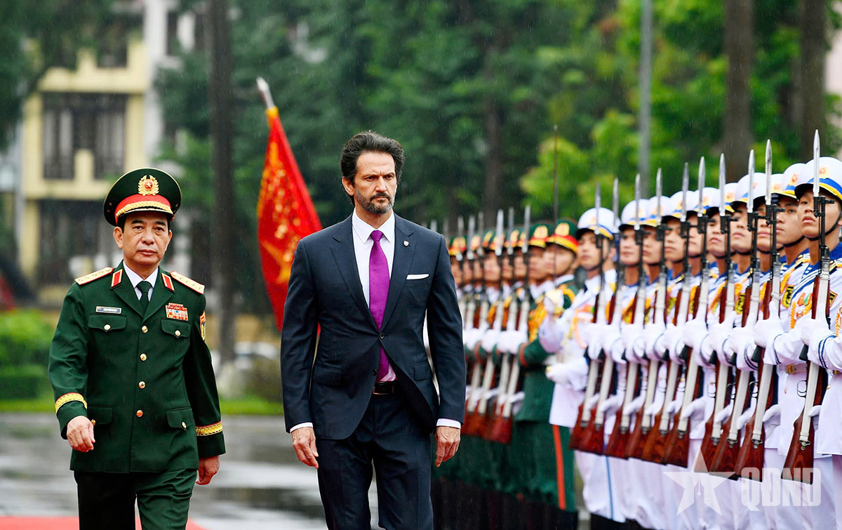 Đại tướng Phan Văn Giang và Phó thủ tướng, Bộ trưởng Bộ Quốc phòng Slovakia Robert Kalinak duyệt Đội danh dự Quân đội nhân dân Việt Nam. Ảnh: TUẤN HUY