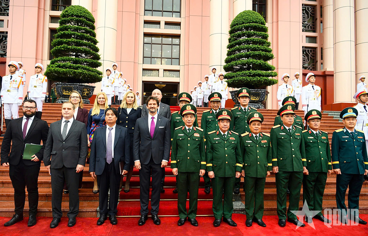 Đại tướng Phan Văn Giang và Phó thủ tướng, Bộ trưởng Bộ Quốc phòng Slovakia Robert Kalinak cùng thành viên hai đoàn chụp ảnh chung. Ảnh: TUẤN HUY
