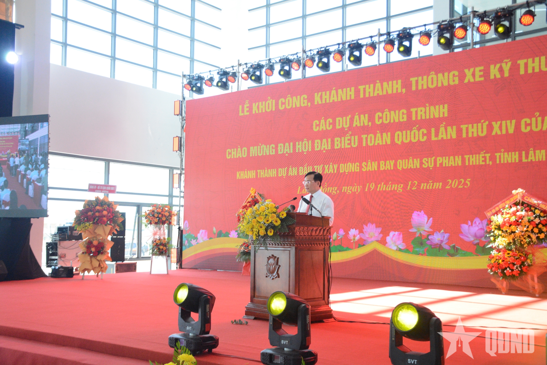 Phát biểu tại Lễ khánh thành, Đại tướng Phan Văn Giang, Ủy viên Bộ Chính trị, Phó bí thư Quân ủy Trung ương, Bộ trưởng Bộ Quốc phòng nhấn mạnh: Sân bay quân sự Phan Thiết được khởi công vào năm 2021, thời điểm đại dịch Covid-19 đang hoành hành, thiên tai, biến đổi khí hậu diễn biến phức tạp, nhiệm vụ phát triển kinh tế - xã hội, đảm bảo quốc phòng, an ninh yêu cầu ngày càng cao.