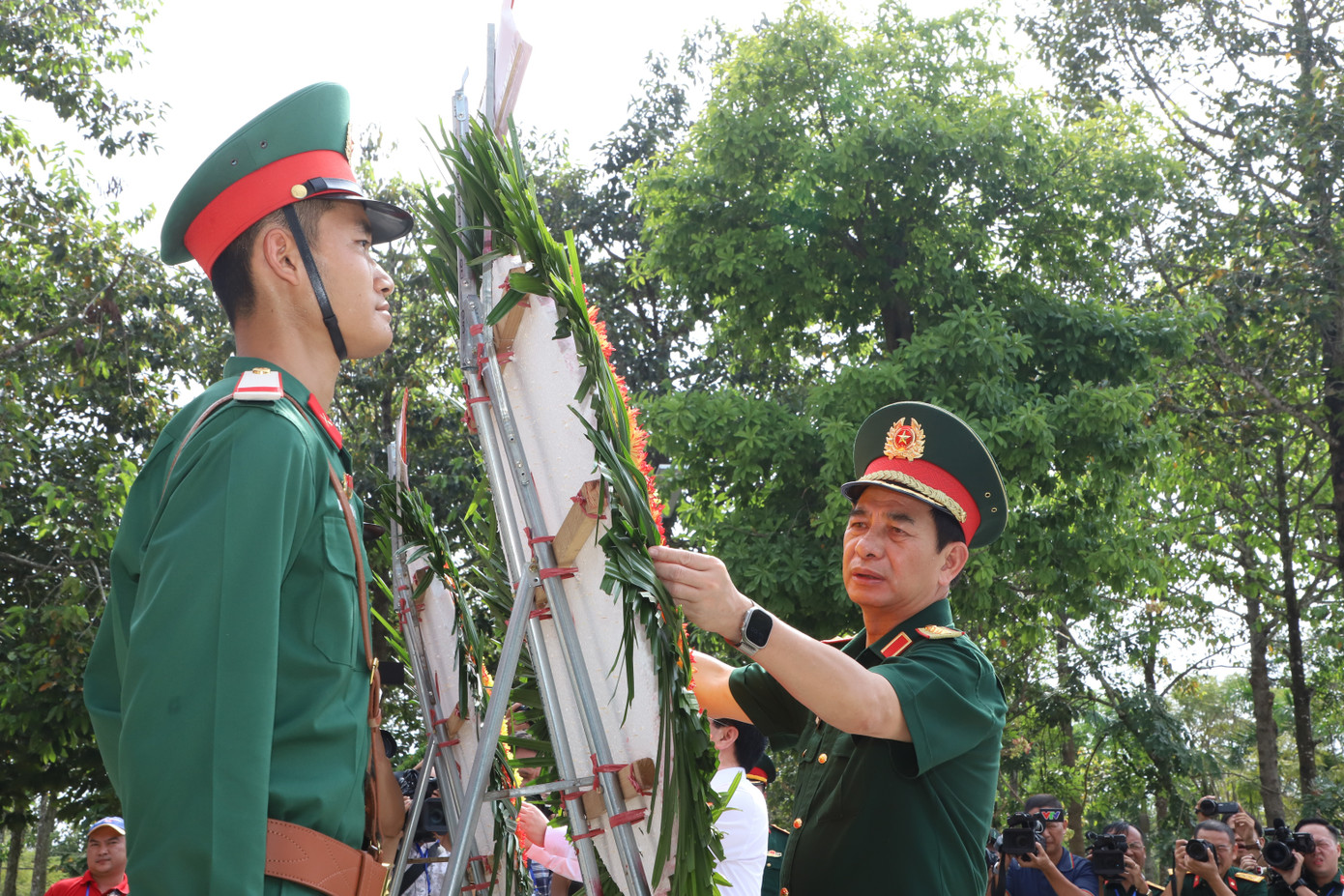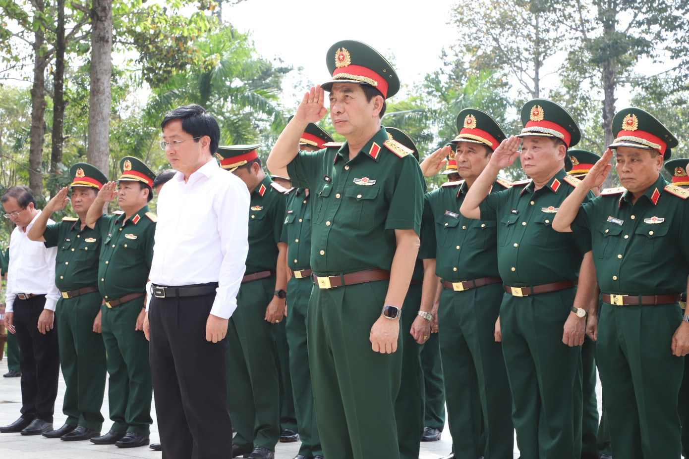 Đại tướng Phan Văn Giang; Bí thư Tỉnh ủy Tây Ninh Nguyễn Văn Quyết cùng đoàn công tác thành kính tưởng niệm Chủ tịch Hồ Chí Minh và các Anh hùng liệt sĩ Sư đoàn 5. Ảnh: Ngô Tùng