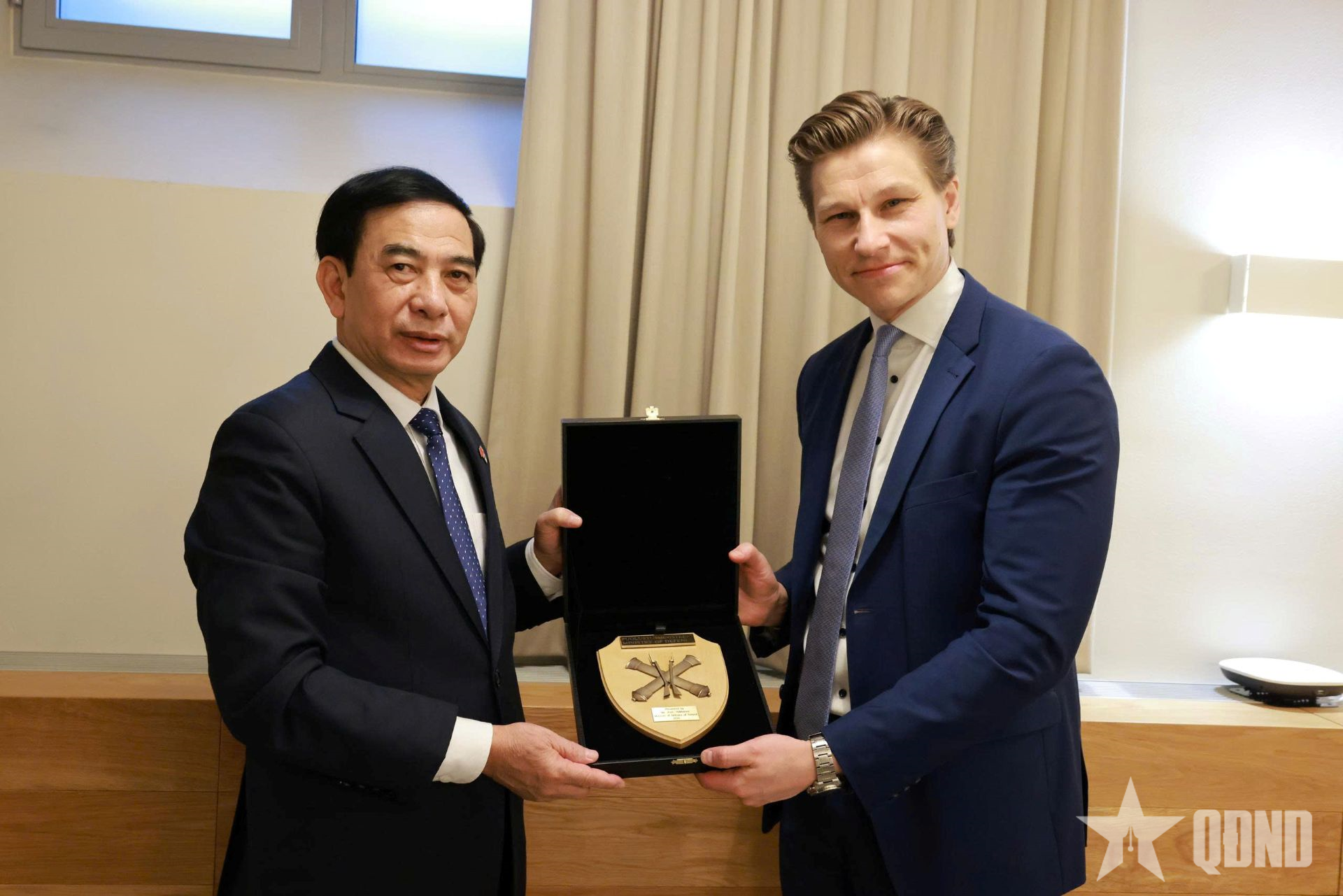 Bộ trưởng Bộ Quốc phòng Phần Lan Antti Hakkanen trao quà lưu niệm tặng Đại tướng Phan Văn Giang.