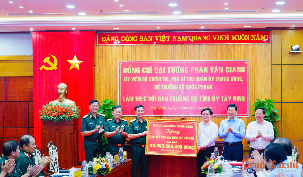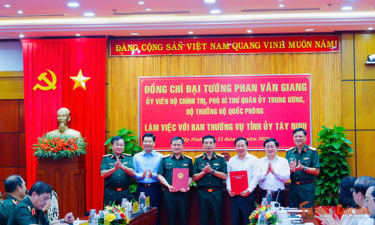 Cũng tại buổi làm việc, Đại tướng Phan Văn Giang đã chứng kiến lễ trao thỏa thuận hợp tác chiến lược (giai đoạn 2026 - 2030) giữa Tập đoàn Viettel và UBND tỉnh Tây Ninh. Đồng thời, Bộ trưởng Bộ Quốc phòng cũng thay mặt Quân ủy Trung ương tặng tỉnh Tây Ninh công trình cầu an sinh xã hội trị giá 30 tỷ đồng.