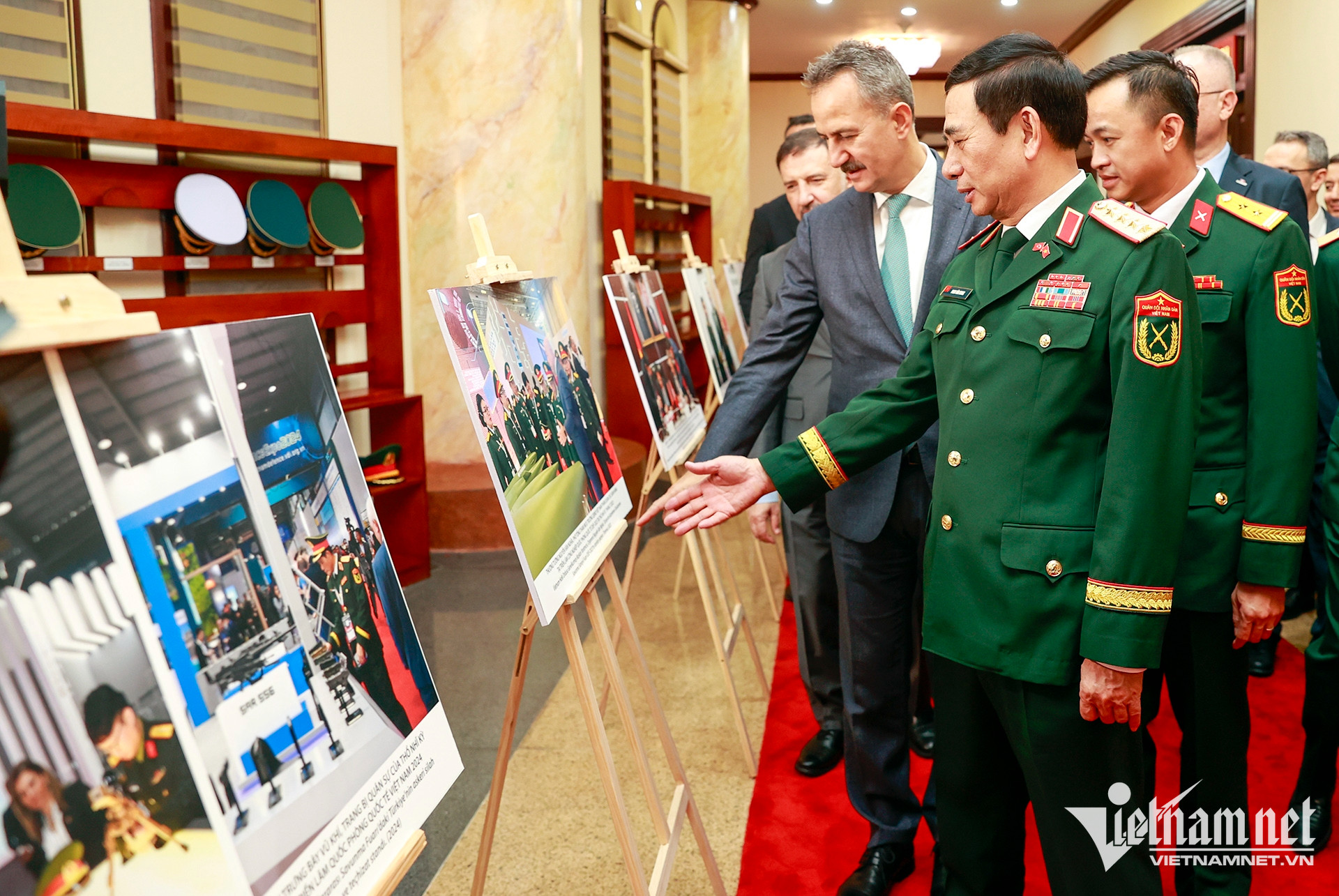 Đại tướng Phan Văn Giang và ông Haluk Gorgun tham quan trưng bày ảnh về quan hệ hợp tác Việt Nam - Thổ Nhĩ Kỳ