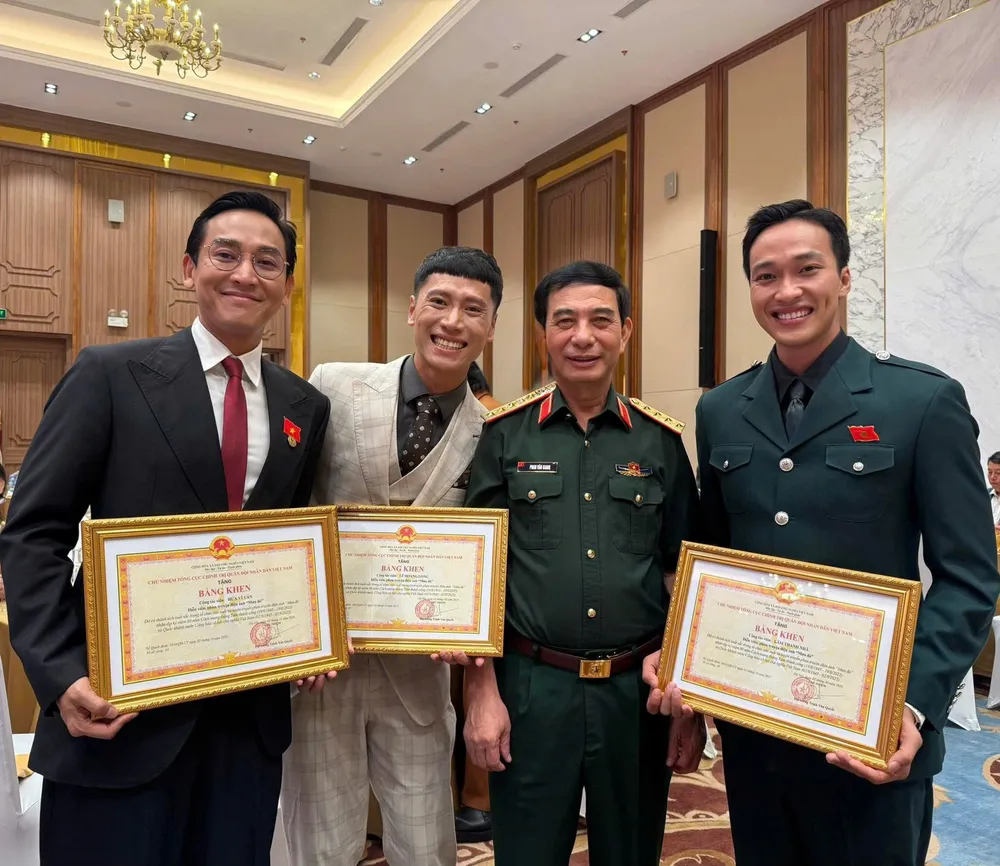 Các diễn viên "Mưa đỏ" nhận bằng khen của Bộ trưởng Bộ Quốc phòng.