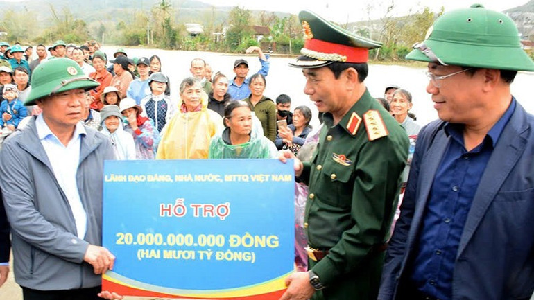 Đồng thời, Đại tướng sự ghi nhận nỗ lực của người dân và chính quyền địa phương trong công tác ứng phó thiên tai, cảm kích trước tinh thần đoàn kết, tương thân tương ái của bà con khi người dân trong thôn, trong xã đã chủ động giúp nhau vượt qua hoạn nạn.
