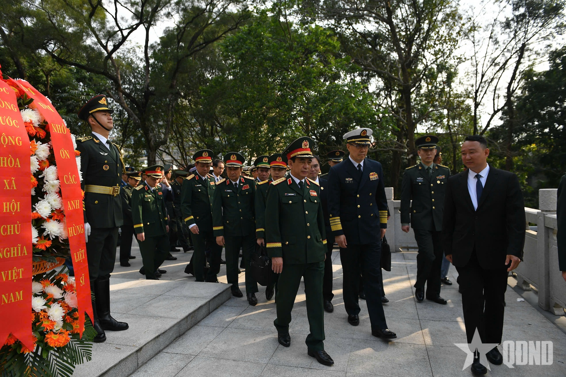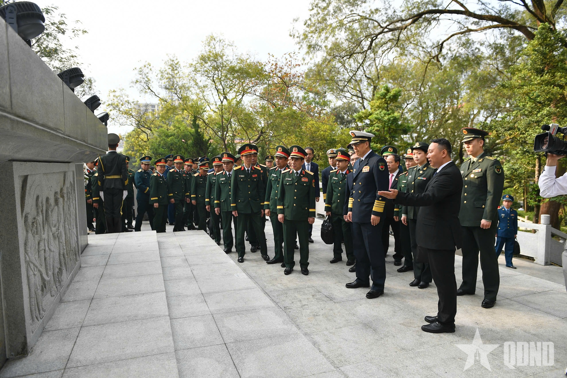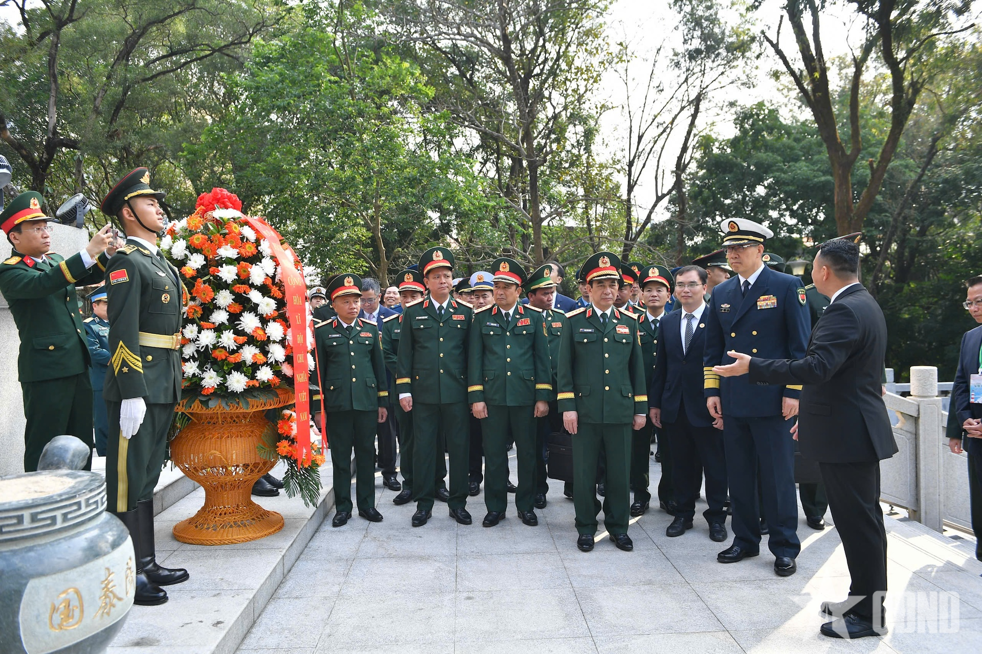 Đại tướng Phan Văn Giang và Thượng tướng Đổng Quân cùng các đại biểu đã dâng vòng hoa trước Đài tưởng niệm liệt sĩ cách mạng nhân dân Việt - Trung; dành một phút mặc niệm các liệt sĩ cách mạng.