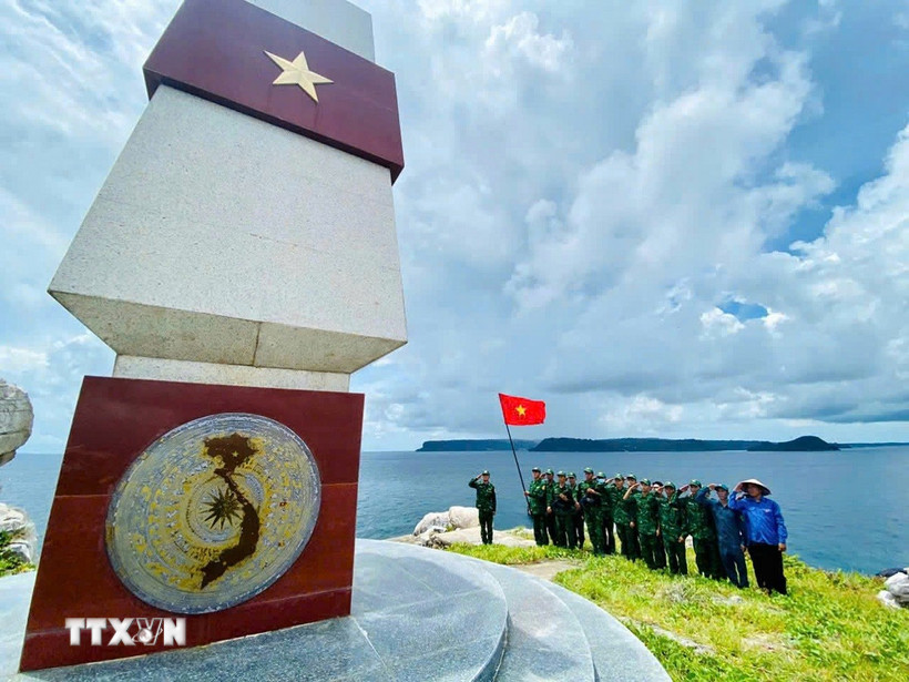 Cán bộ, chiến sỹ Đồn Biên phòng Thổ Châu và nhân dân địa phương thăm mốc giới điểm A1 (đường cơ sở Việt Nam đánh dấu dùng để tính chiều rộng lãnh hải trên vùng biển Việt Nam). (Ảnh: Văn Sĩ/TTXVN)