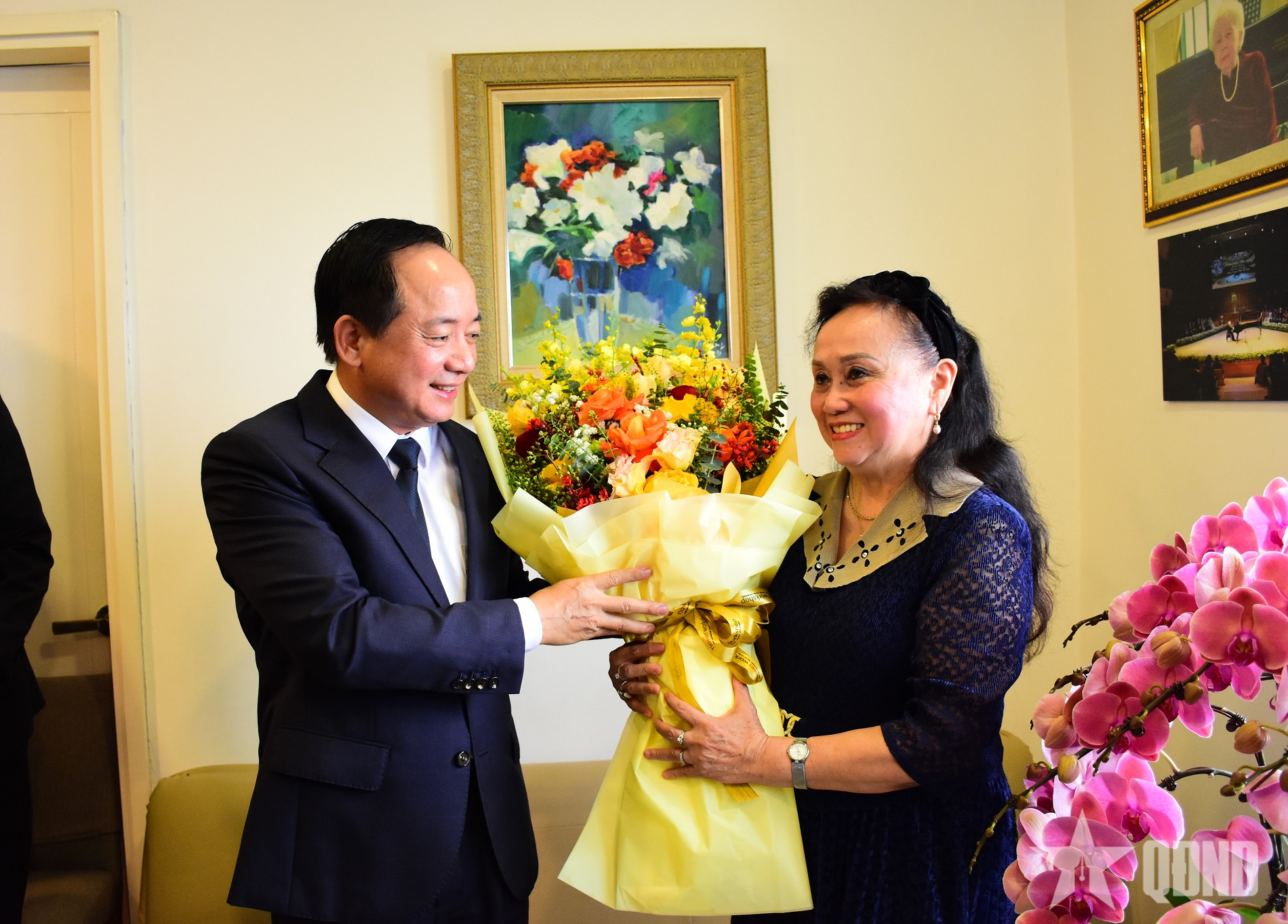 Đồng chí Trịnh Văn Quyết tặng hoa chúc mừng GS, NGND Trần Thu Hà.