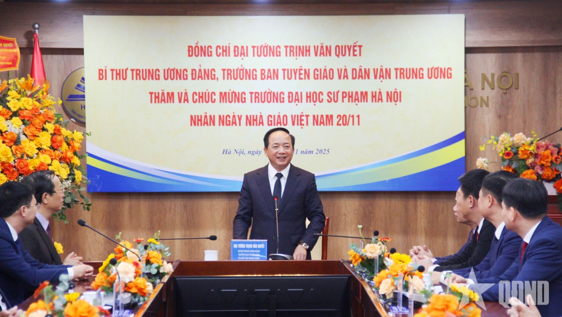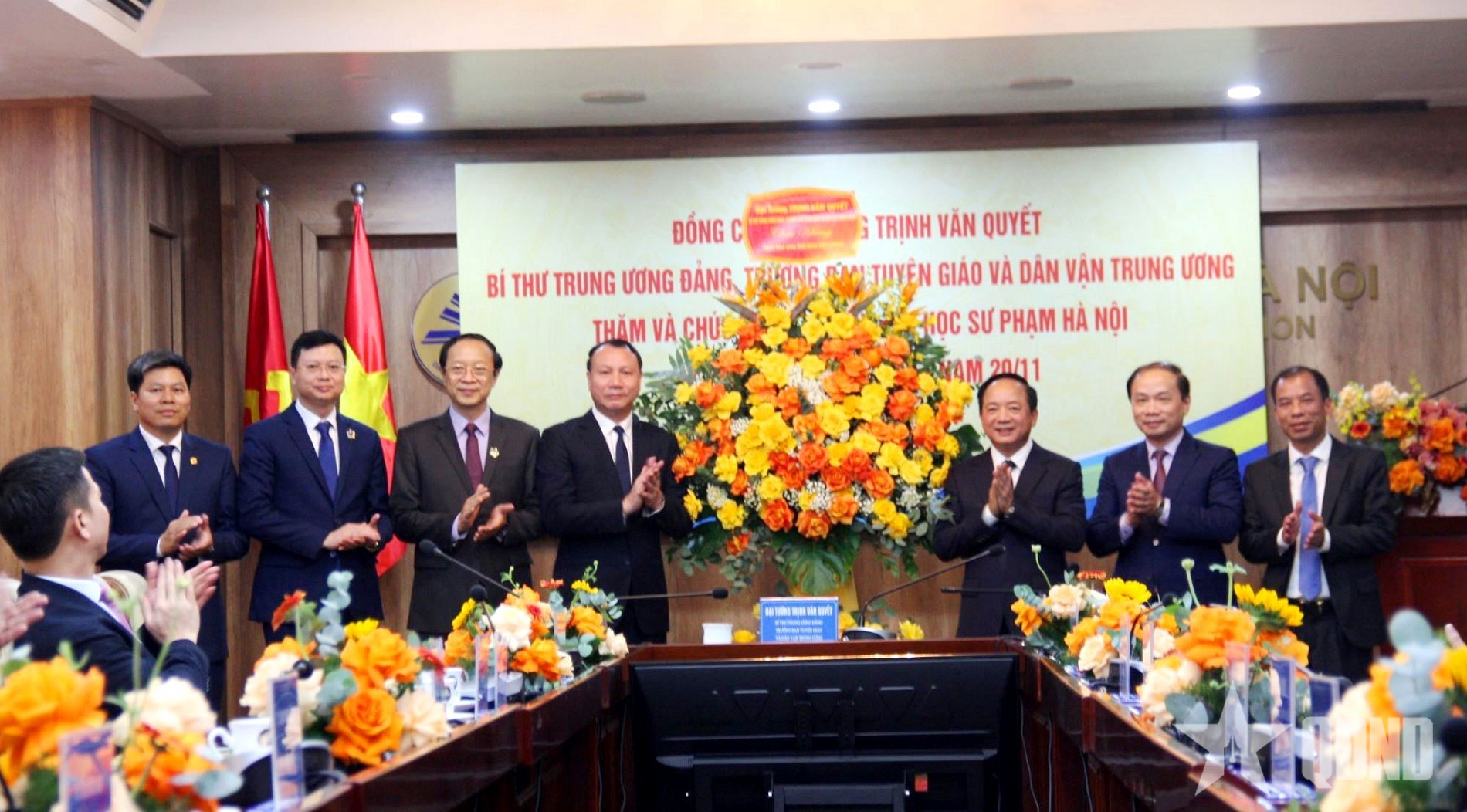 Đồng chí Trịnh Văn Quyết tặng hoa chúc mừng Trường Đại học Sư phạm Hà Nội.