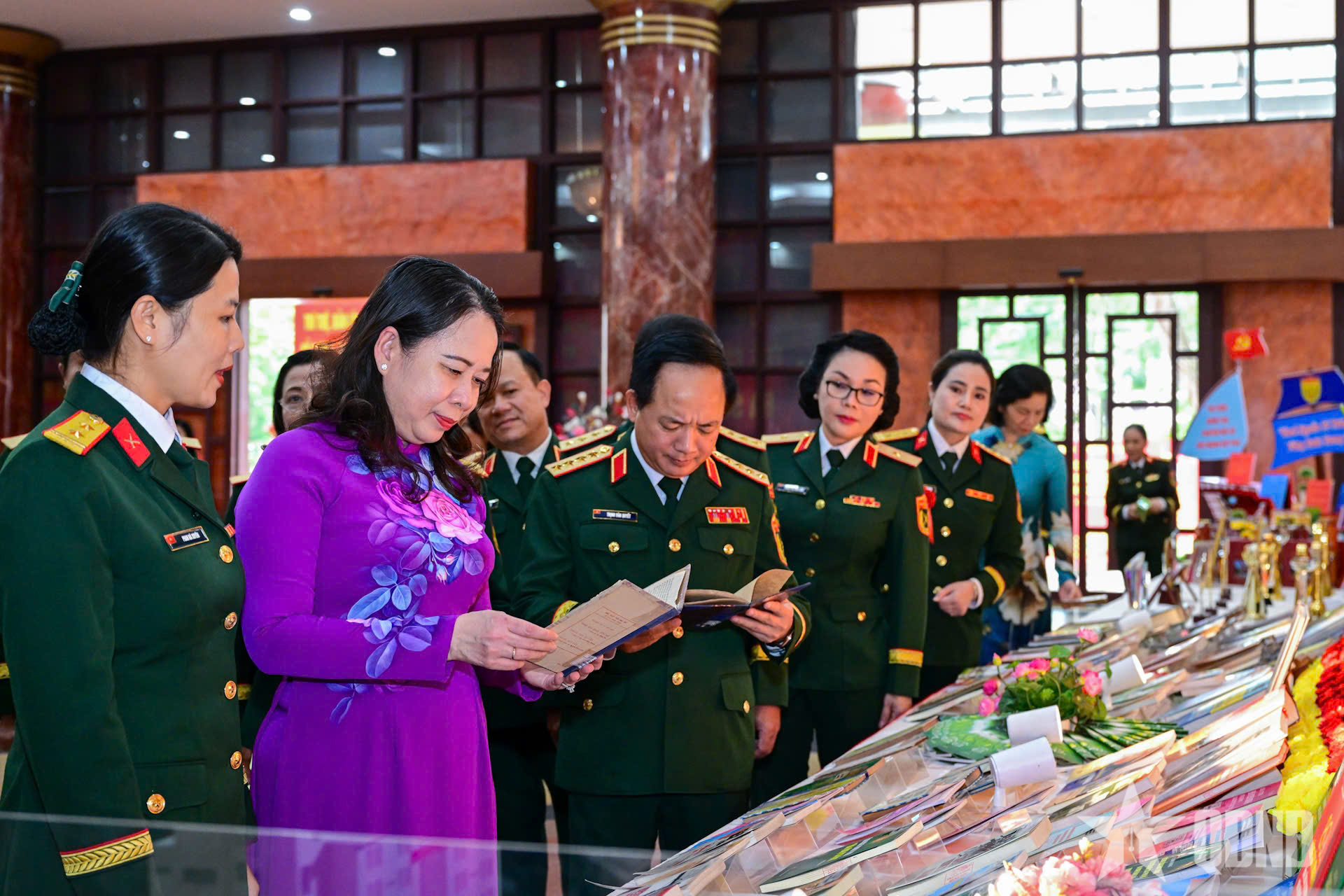 Đại tướng Trịnh Văn Quyết, Phó chủ tịch nước Võ Thị Ánh Xuân và các đại biểu tham quan khu trưng bày chào mừng chương trình tuyên dương.